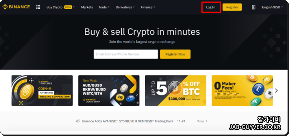바이낸스 홈페이지로 접속 후 로그인합니다.
