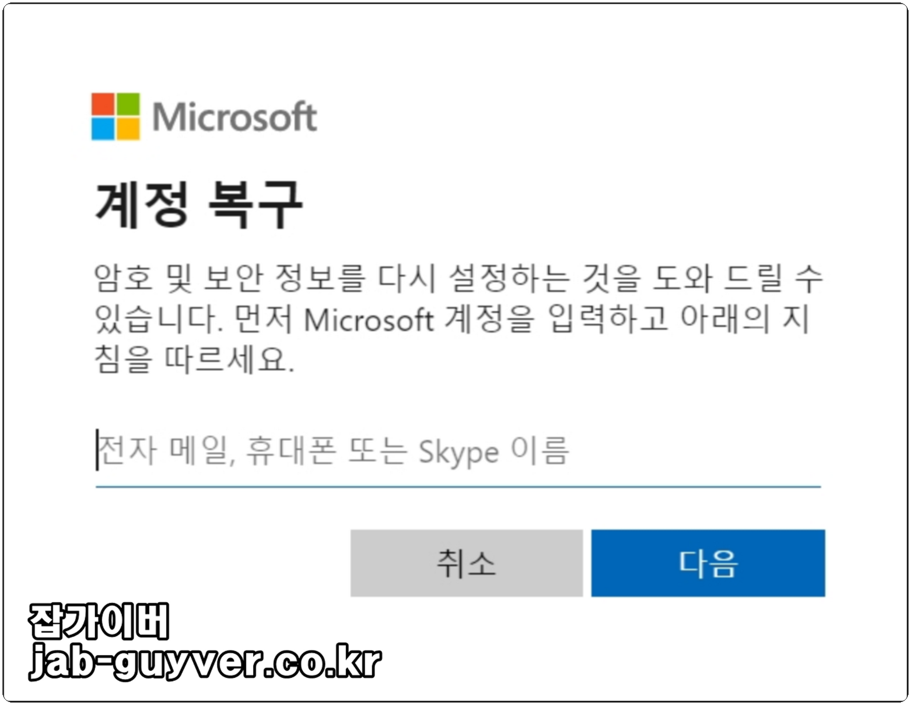 마이크로소프트 계정복구 페이지로 접속 후 로그인합니다.