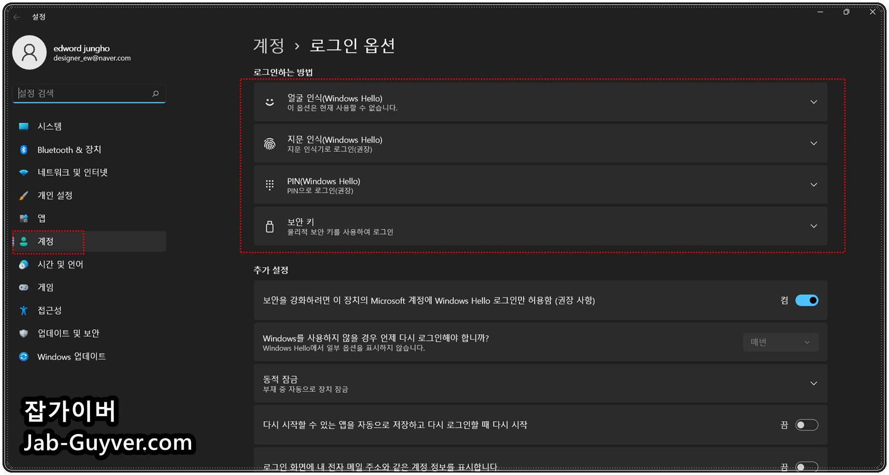 회사나 타인 명의로 등록된 노트북은 로컬 계정이 아닌 회사 도메인 계정으로 연결되어 있을 수 있습니다.