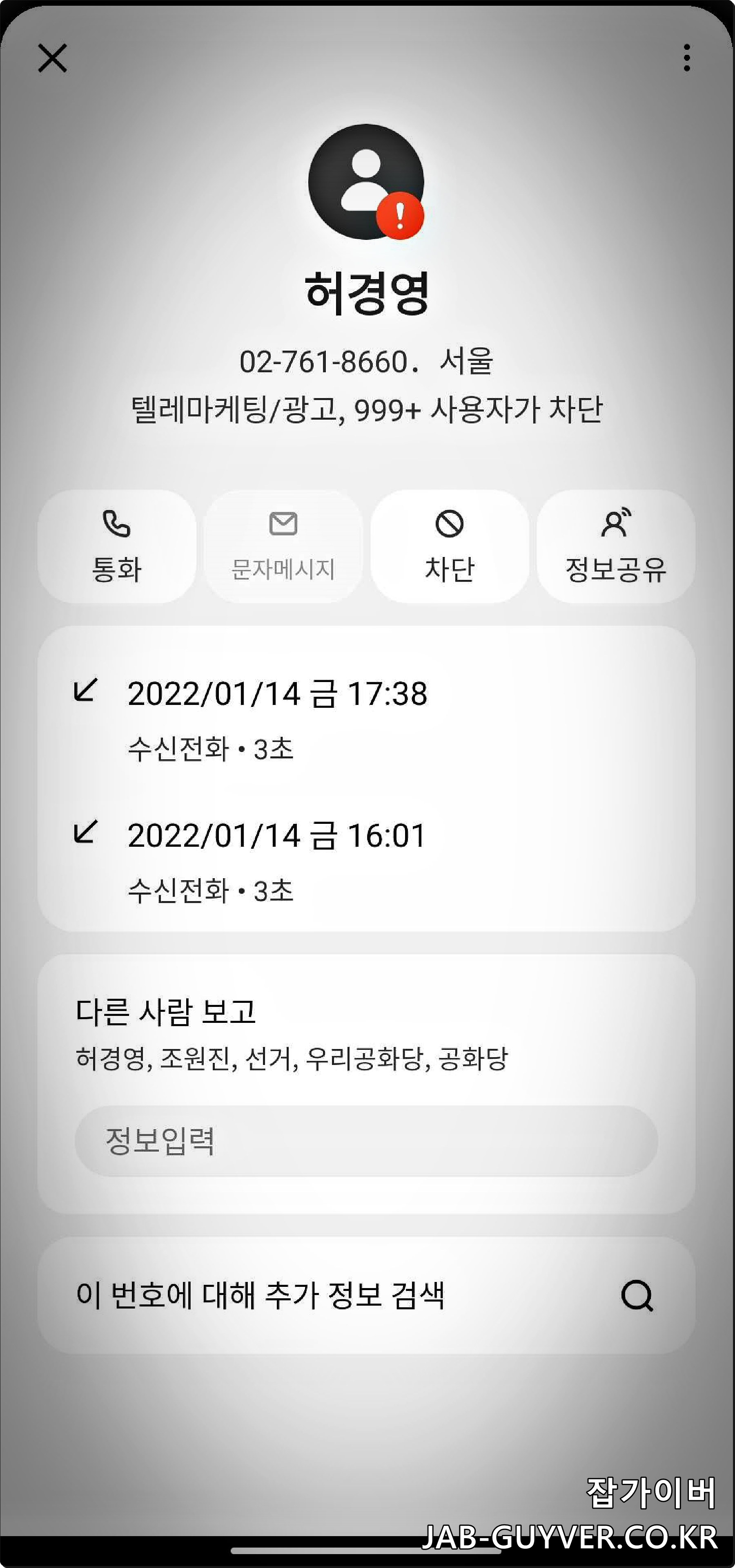 - 답변: 허경영과 관련된 스팸 전화번호(예: 02-761-8660)는 전화번호 차단 기능을 통해 차단할 수 있습니다. 해당 번호를 전화 앱에서 차단하고, 스팸 전화 차단 앱을 설치하여 실시간으로 추가 차단을 설정하는 것이 좋습니다.