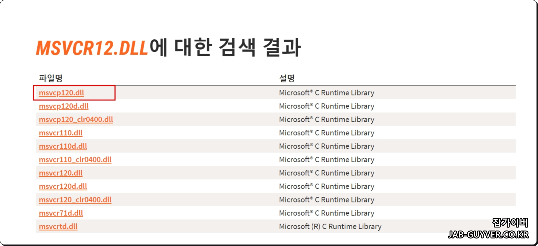 사이트로 들어가서 검색창에 MSVCP120.DLL 혹은 MSVCR120.DLL을 입력하면 관련 파일 목록이 나옵니다.