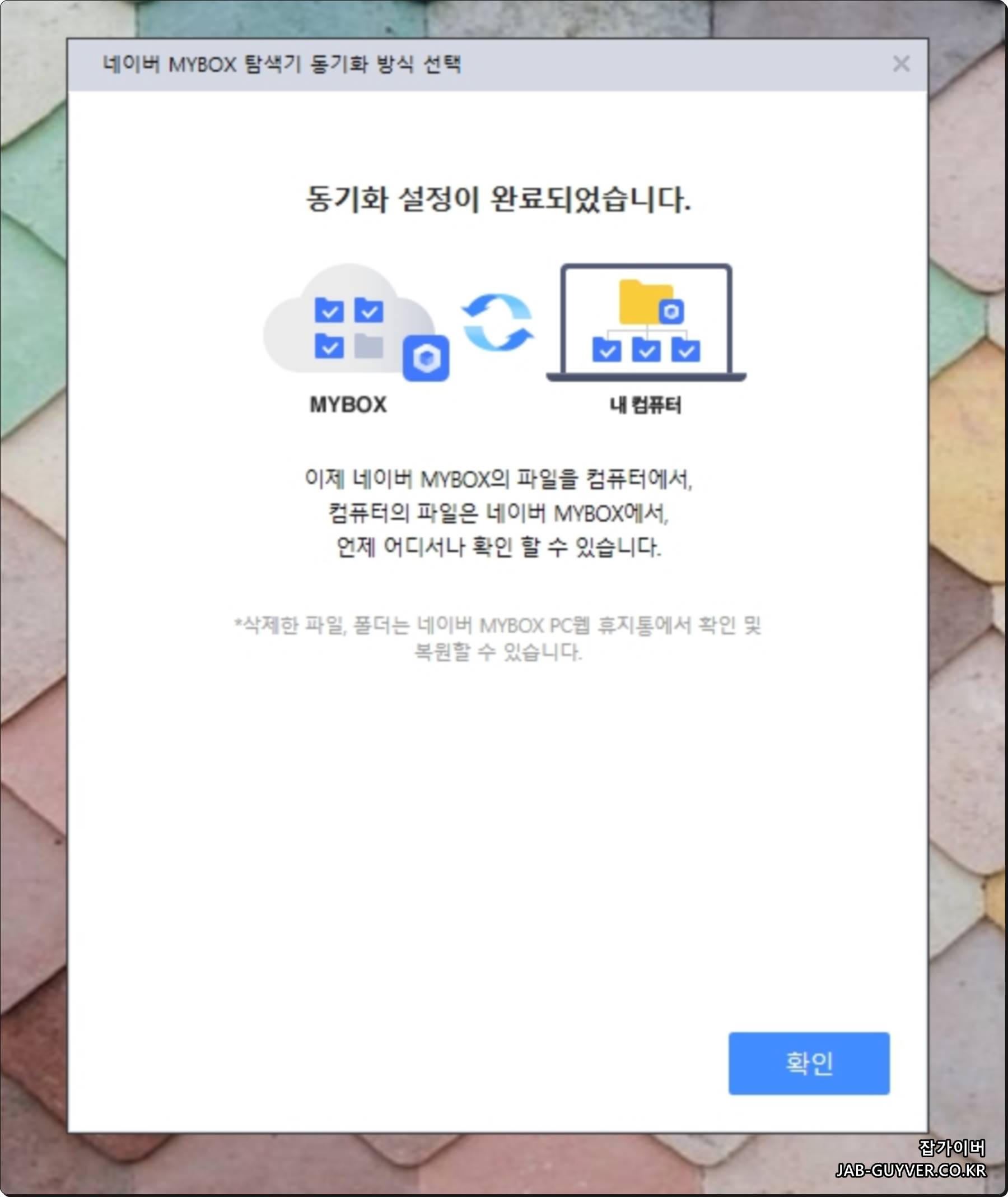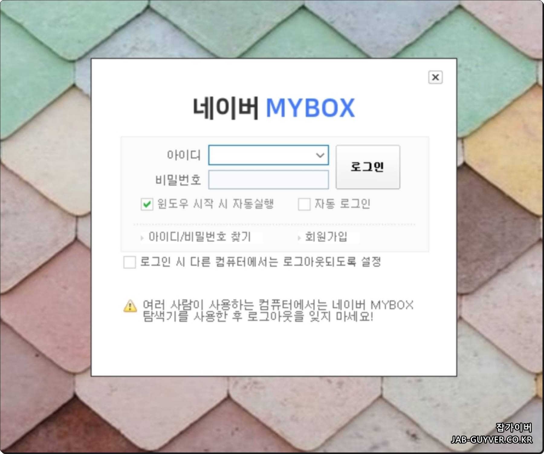이후부터는 별도의 로그인 과정 없이 PC 전원을 켤 때 자동으로 Mybox 동기화가 시작됩니다.