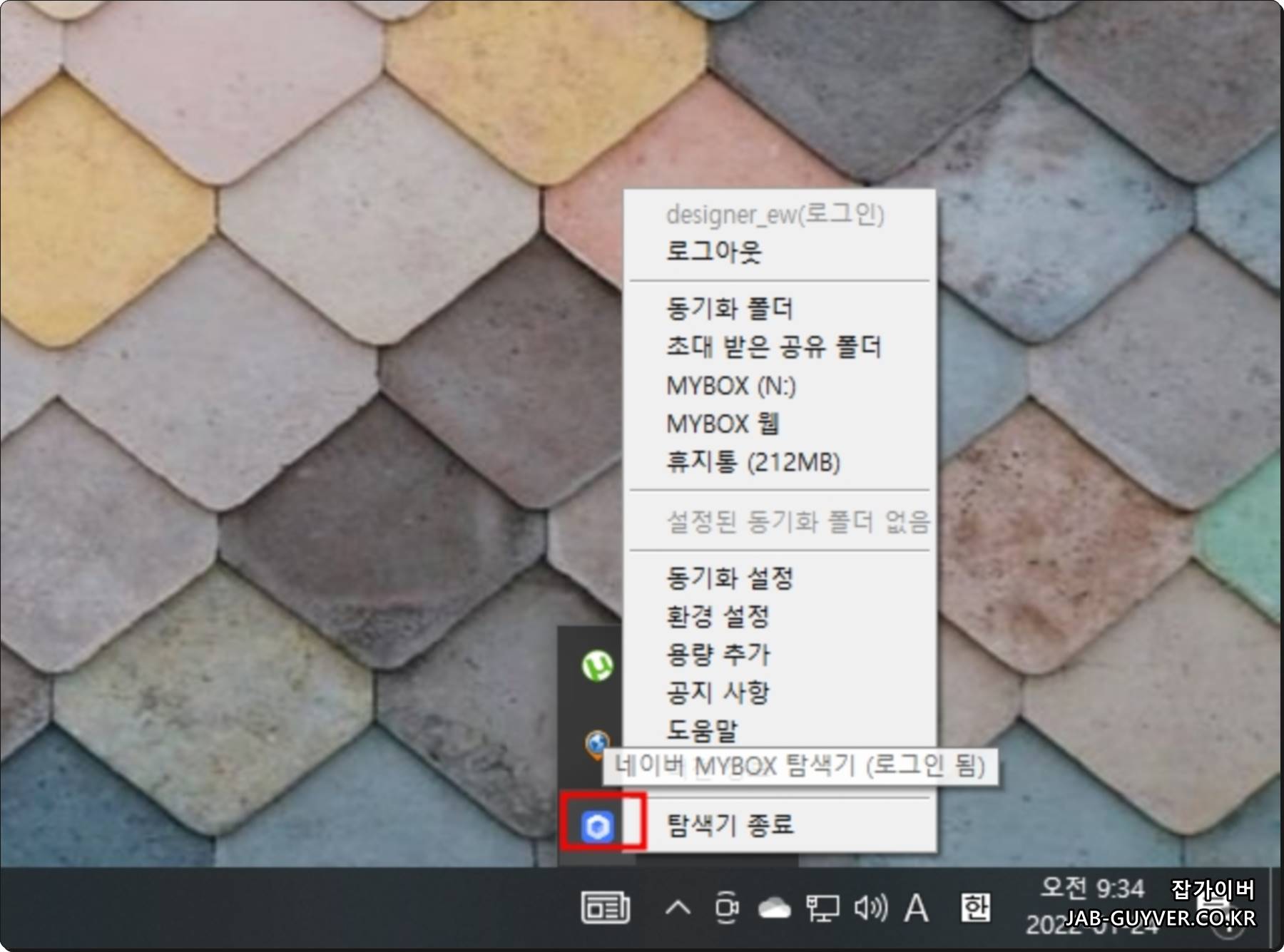 설치가 끝나면 작업표시줄에 네이버 Mybox 아이콘이 생기고, 여기에서 동기화 일시정지·휴지통 비우기·용량 확인·환경설정 같은 기본 관리 기능을 바로 실행할 수 있습니다.
