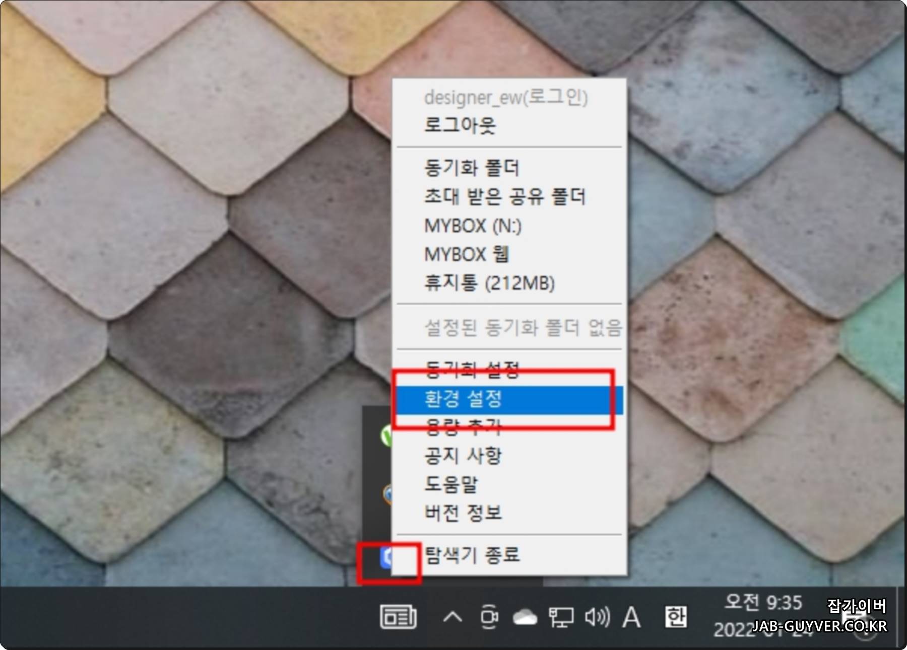 이렇게 네이버 드라이브가 설치가 완료되면 작업표시줄에 네이버 마이박스 아이콘이 활성화되고 동기화폴더 및 휴지통비우기, 동기화설정, 용량추가등이 가능합니다.