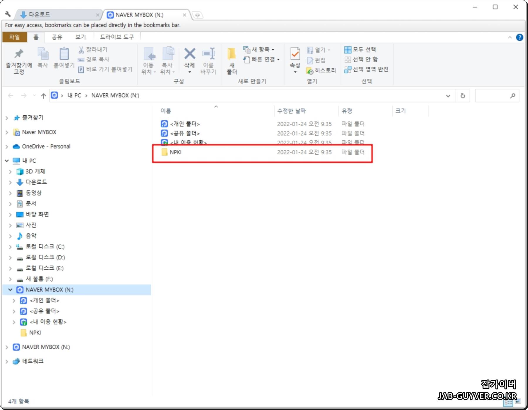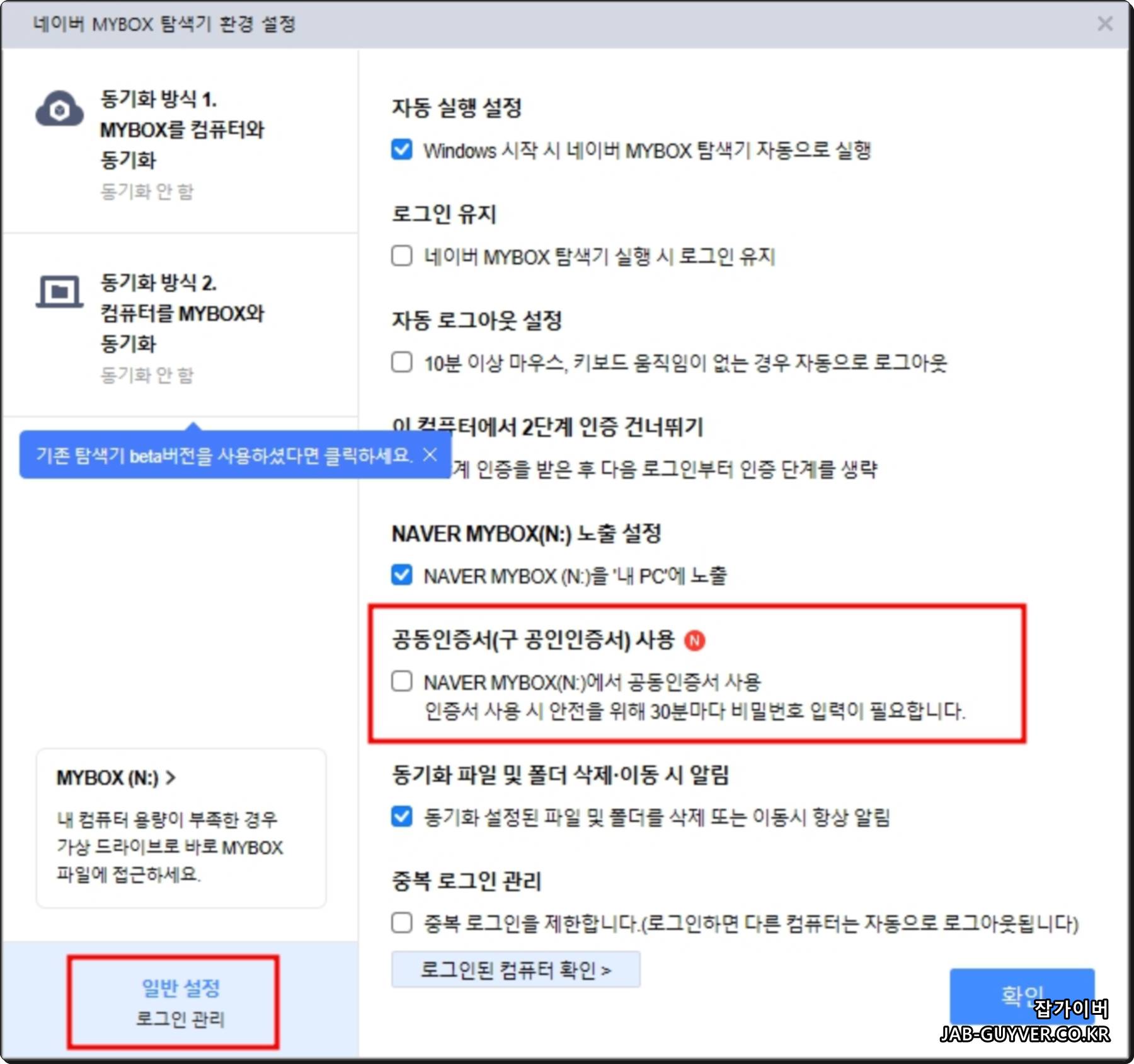 최근에는 금융인증서나 네이버·카카오 인증서처럼 새로운 방식이 많이 쓰이고 있지만, 여전히 공동인증서(구 공인인증서)를 요구하는 사이트들도 남아 있습니다. 이럴 때는 Mybox 설정에서 공동인증서 사용 옵션을 켜 두면, 네이버 Mybox 안에 NPKI 폴더가 자동으로 생성되고 여기에서 공인인증서를 읽어 로그인할 수 있습니다.