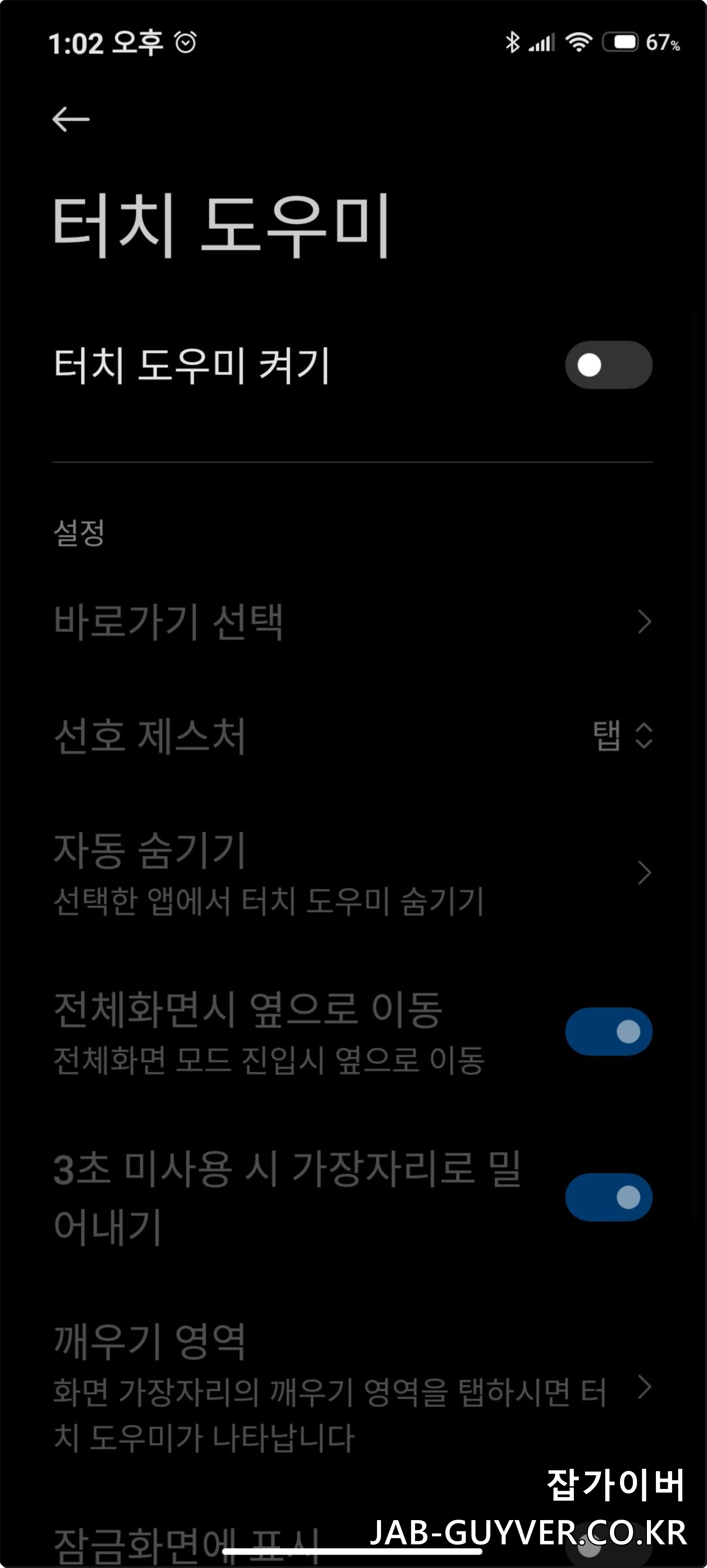 최근 출시되는 스마트폰은 디스플레이 크기가 커지면서 한 손으로 터치하기가 쉽지가 않기 때문에 큰 액정에 한 손 터치를 주로 하는 분들에게는 터치 도우미를 활성화하는 것이 좋습니다.