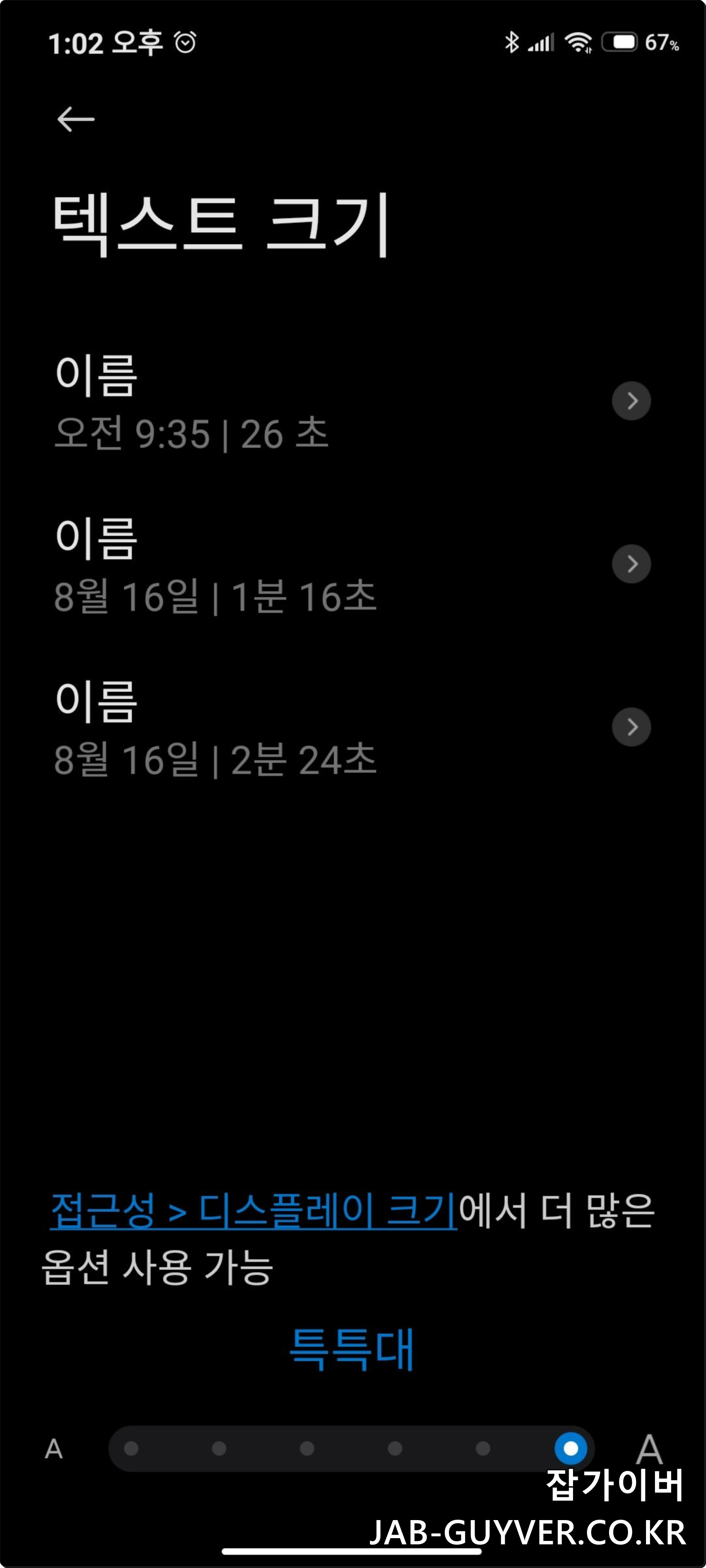 샤오미 Miui 운영체제 기준이며 설정 -> 디스플레이 -> 시스템 글꼴 (텍스트 크기)를 선택합니다.