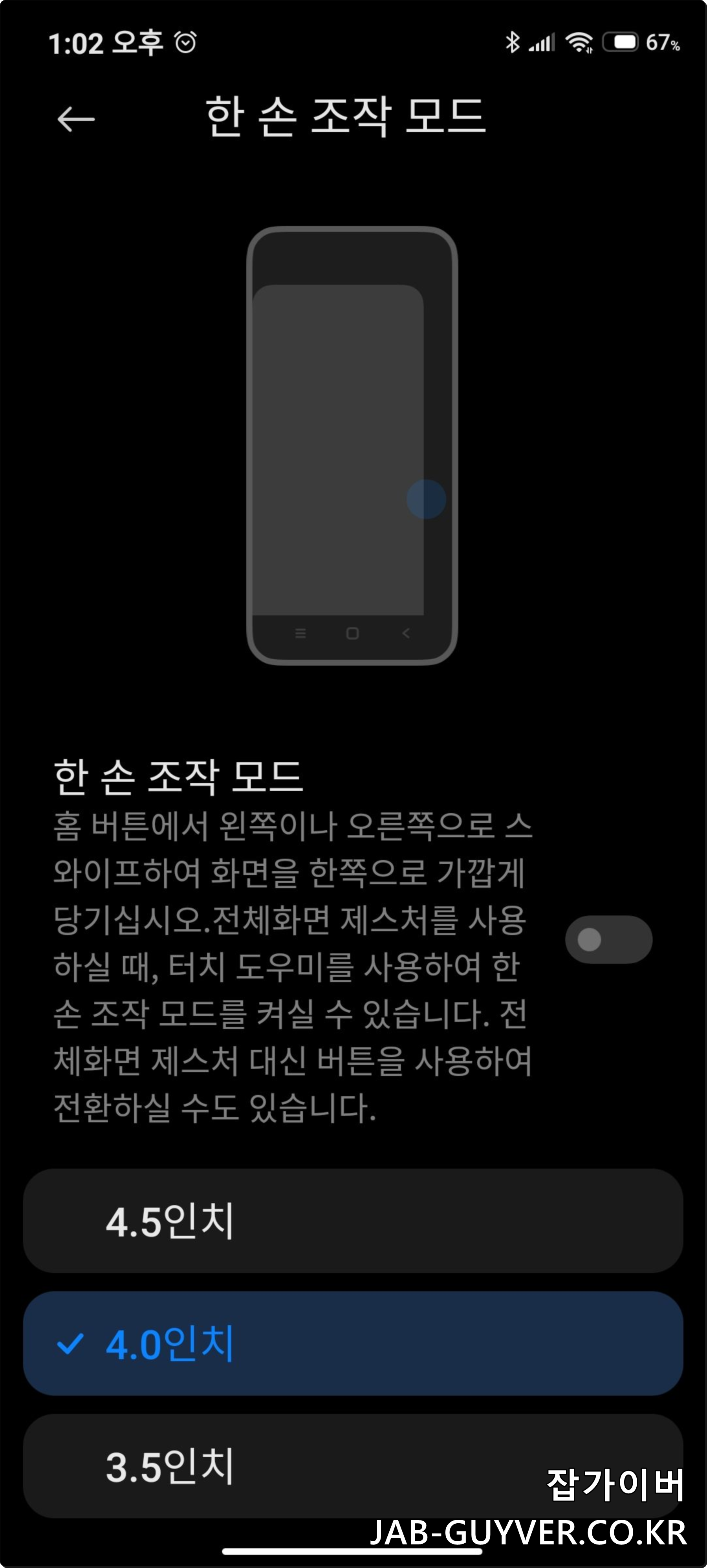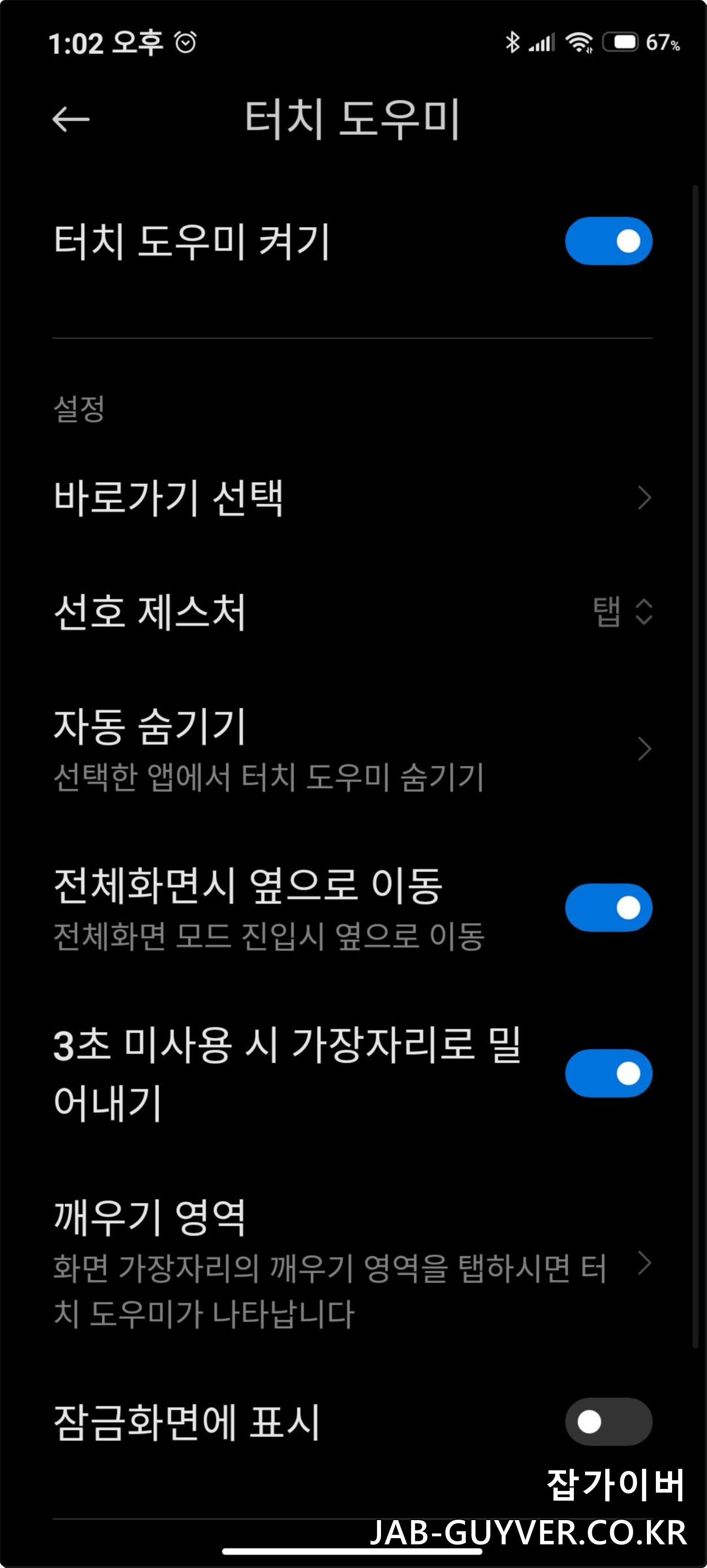 최근 출시되는 스마트폰은 디스플레이 크기가 커지면서 한 손으로 터치하기가 쉽지가 않기 때문에 큰 액정에 한 손 터치를 주로 하는 분들에게는 터치 도우미를 활성화하는 것이 좋습니다.