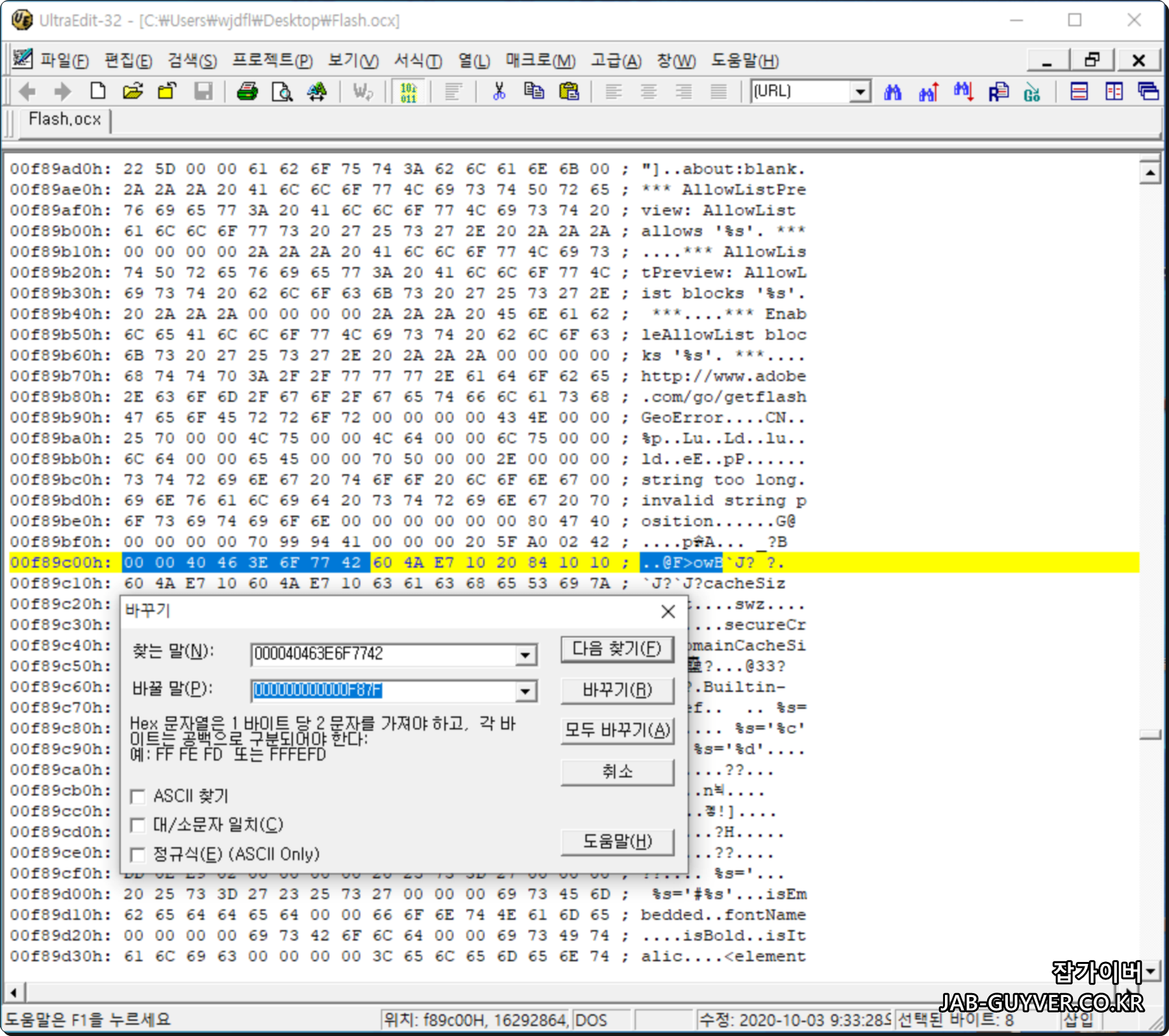 해당 플래쉬 경로에 이동하면 OXC 파일을 찾울 수 있으며 Flash32_32.0.0_465.ocs의 파일을 에디트 프로그램을 이용해 실행합니다.