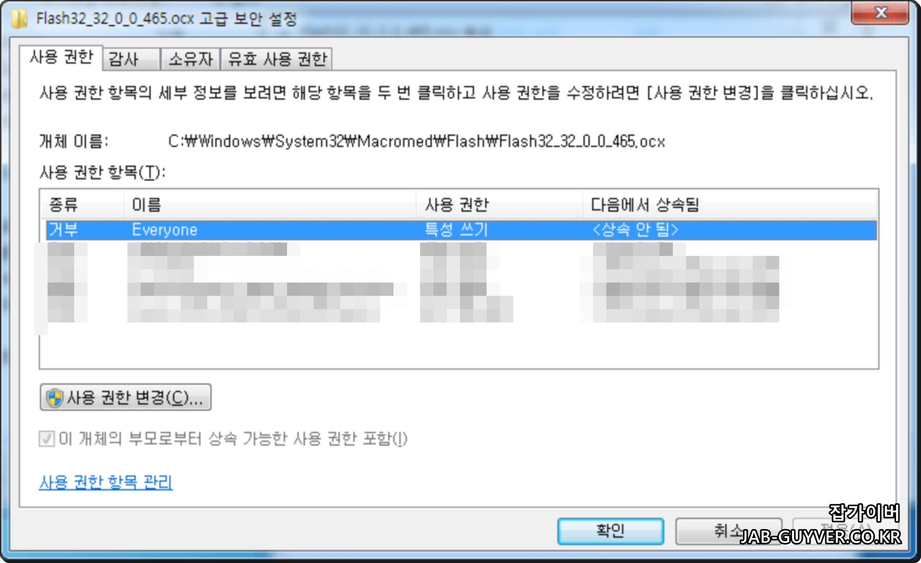 고급보안설정을 통해 쓰기 거부 권한을 Everyone 거부를 해제하면 플래쉬 사용이 허용됩니다.