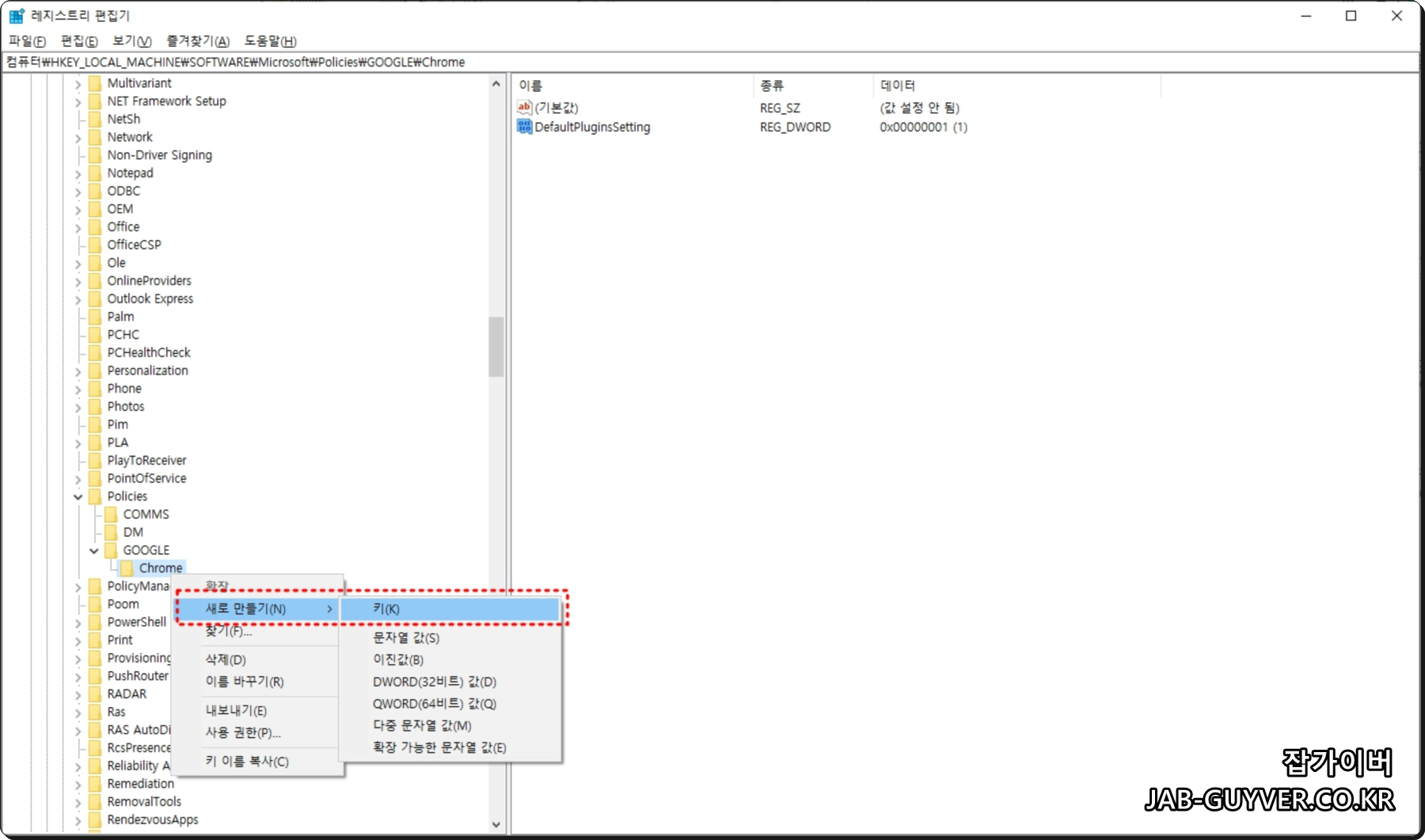 이후 Policies 경로에 새로만들기 -> 키를 통해 구글과 크롬 항목을 새롭게 추가해야합니다.