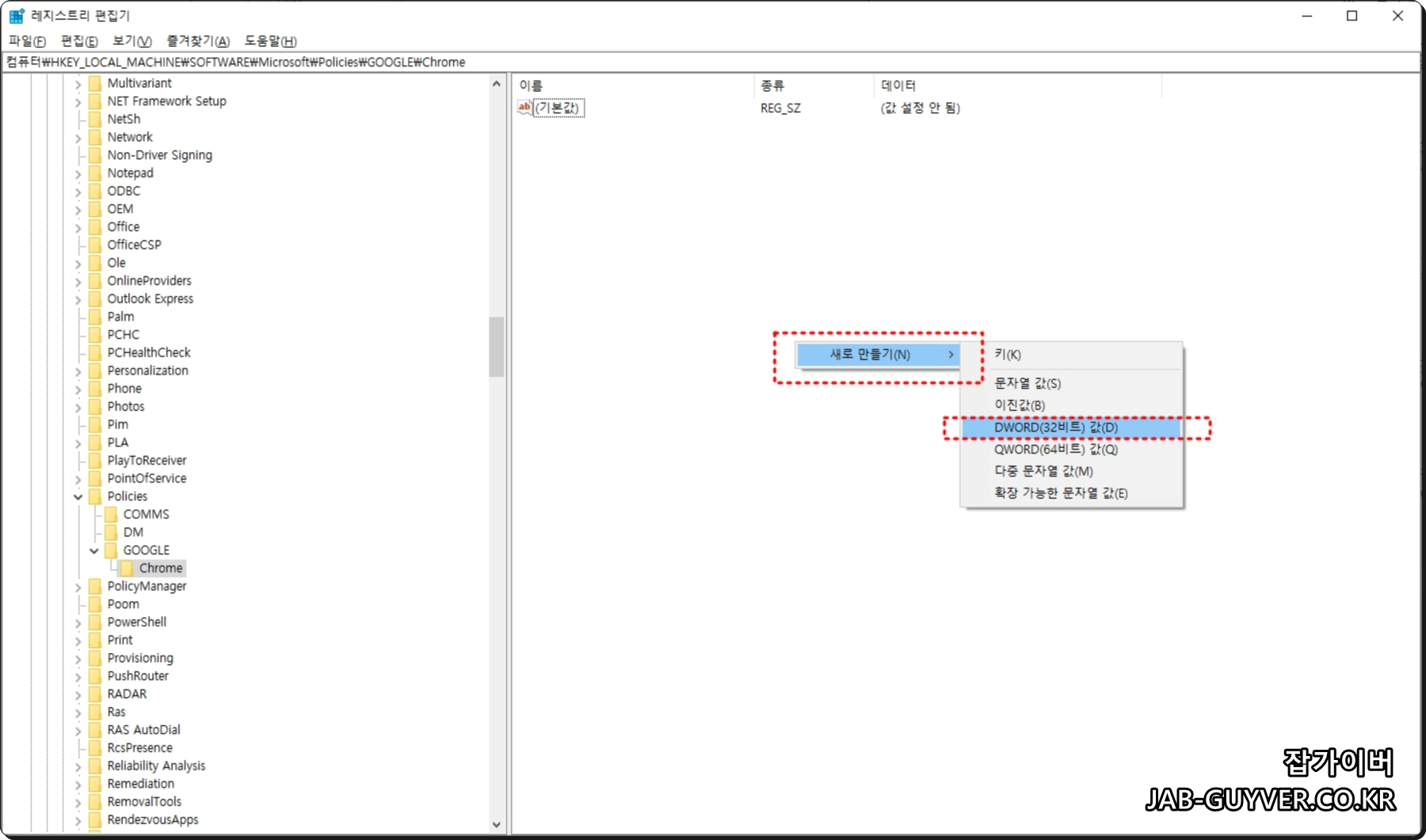 Chrome 경로에 DWORD (32BIT)를 새로 만듭니다.