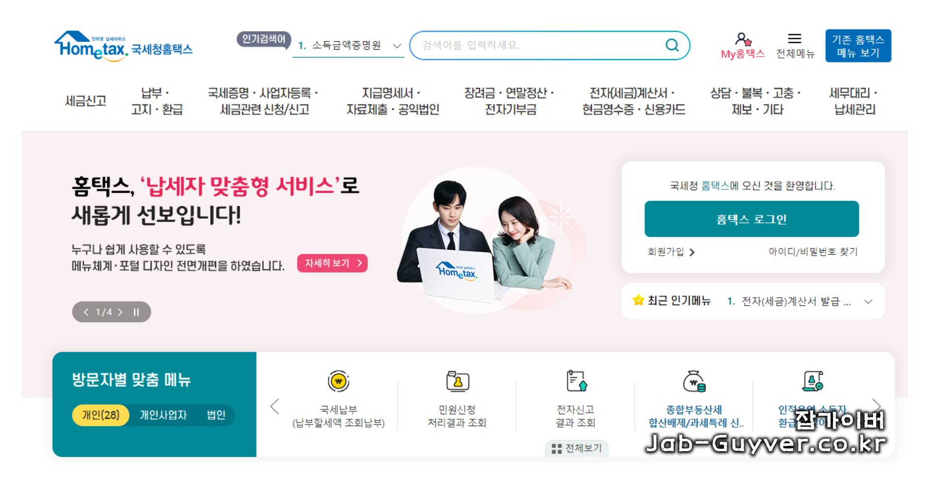 또한, 홈택스 웹사이트에 접속하려면 WWW.HOMETAX.GO.KR 주소를 사용할 수 있습니다. 현재는 간소화된 서비스로 메인 페이지가 변경되었으며, 아래의 안내를 따라 접속할 수 있습니다.