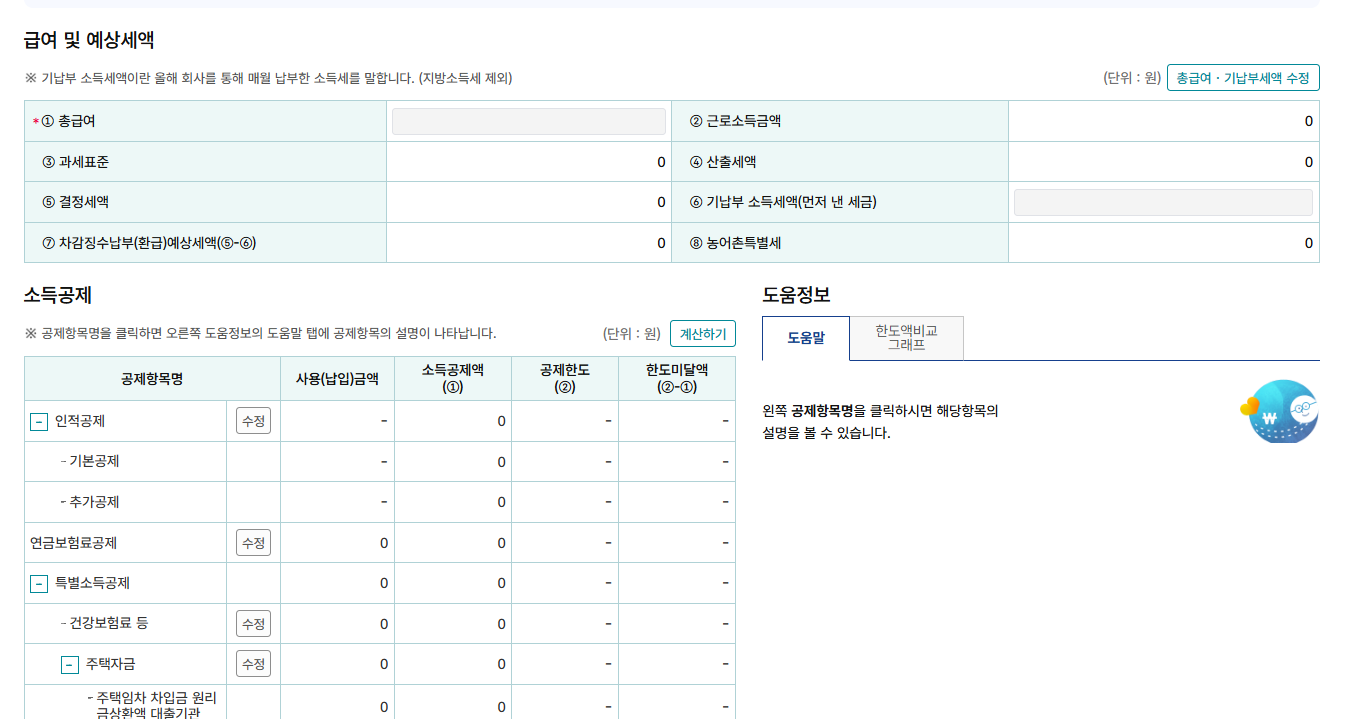 소득세와 같은 세금은 월마다 봉급이 달라질 수 있으므로 정확한 정보 입력이 필요합니다. 또한, 기납부세액(먼저 낸 세금)이 있다면 해당 정보도 입력해야 합니다.