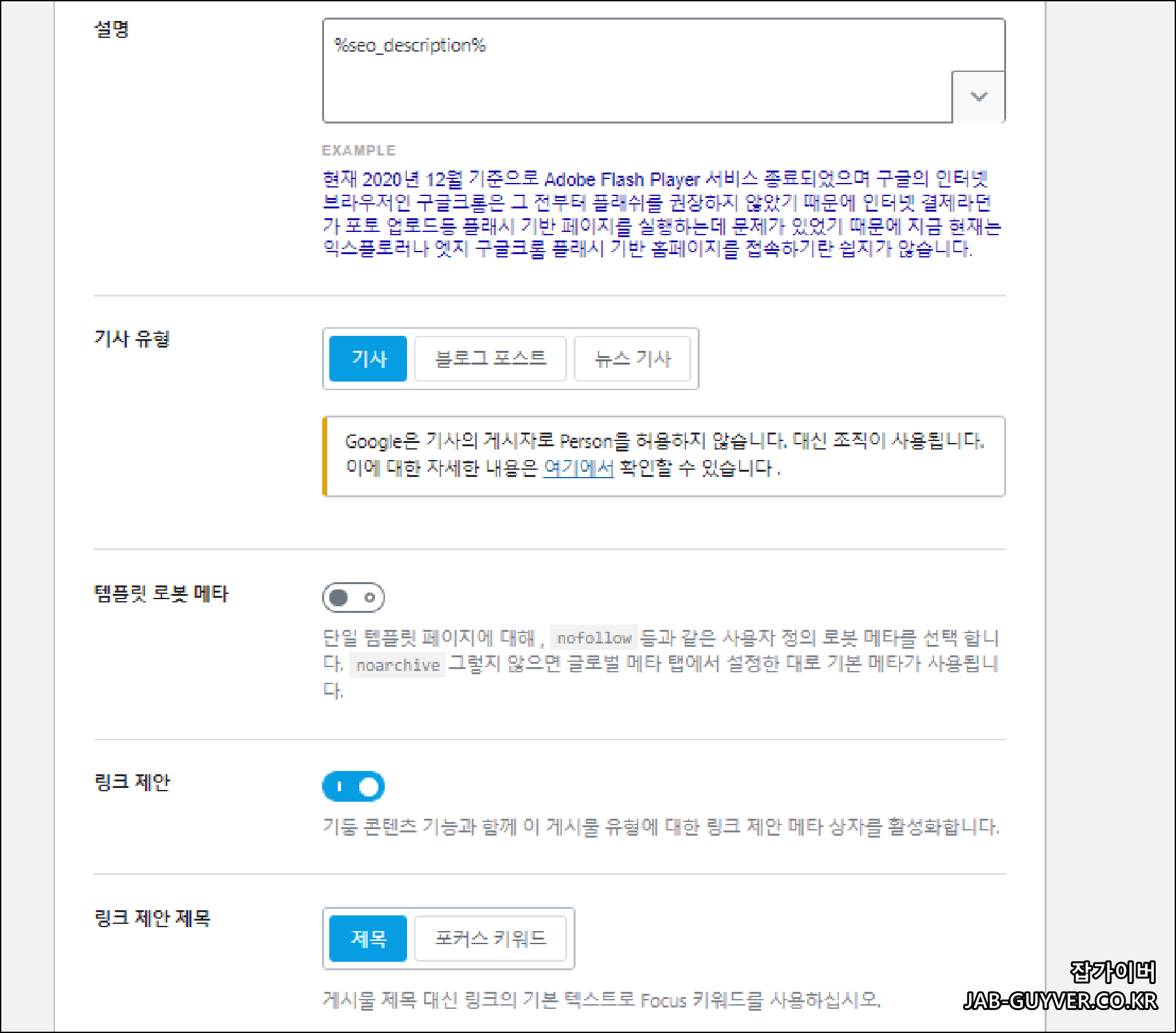 작성자의 저자 정보도 검색엔진에 노출시킬 것인지 선택하고 형식을 지정합니다.