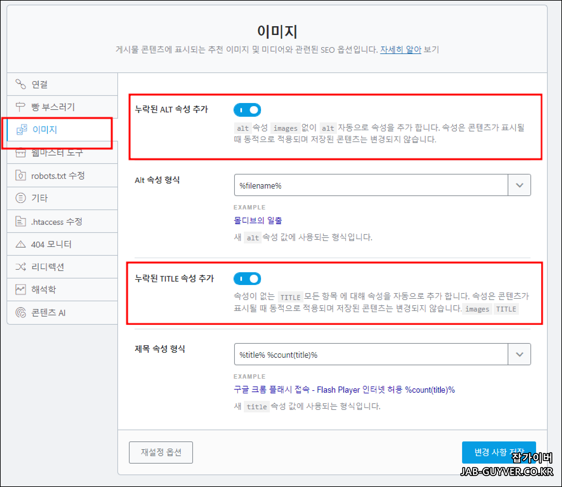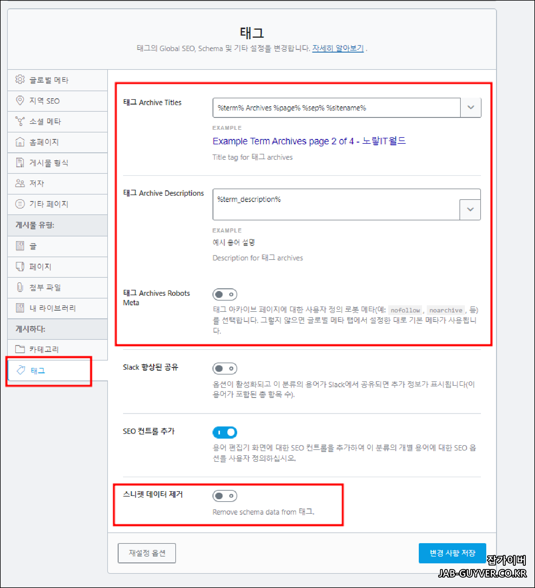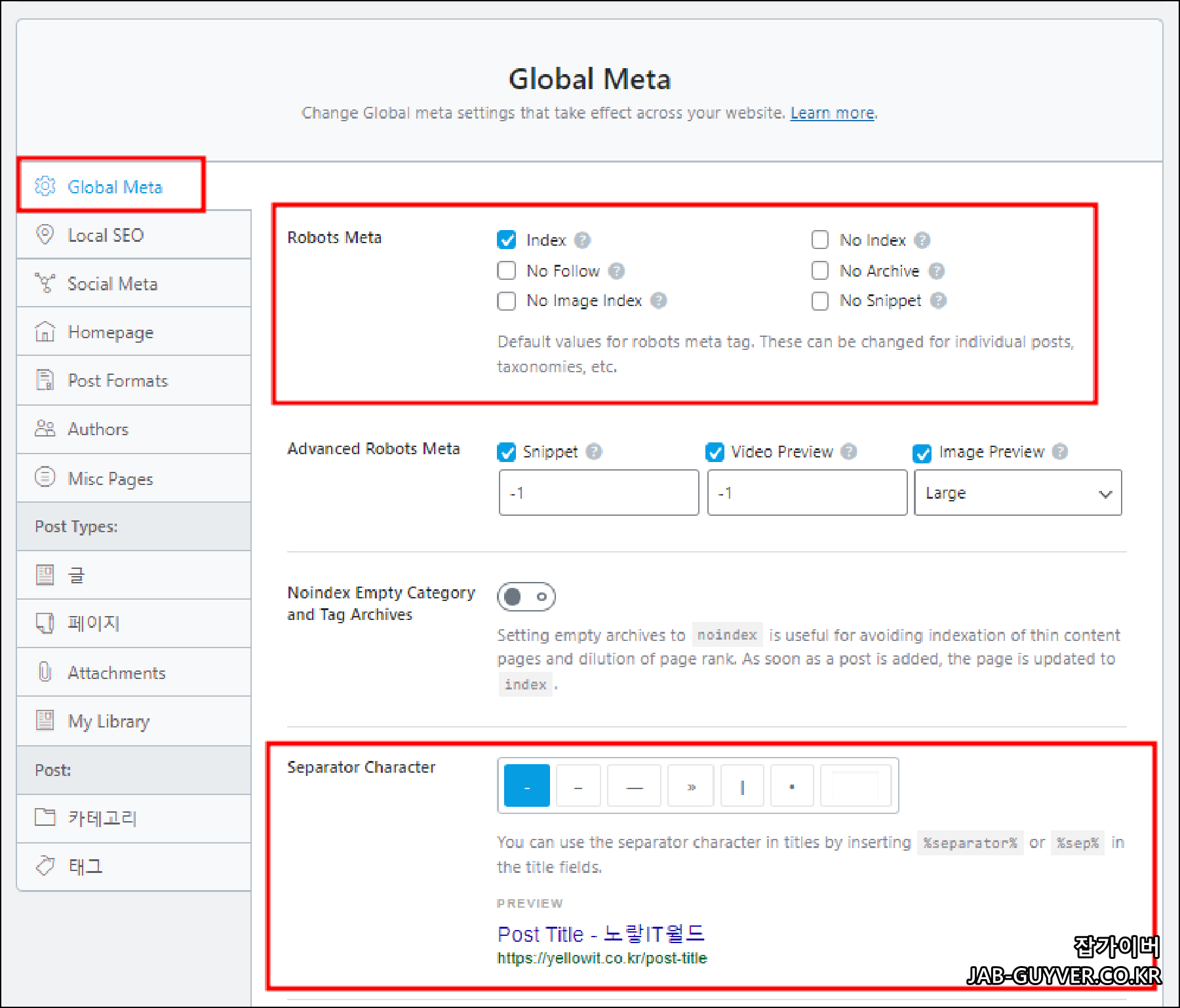 그리고 특히 구글 검색엔진에서 자주 보이는 포스트 형식 아카이브 "Archive Titles"의 이름 조합을 지정하며 형식에 대한 아카이브 로봇 정보를 설정합니다.
