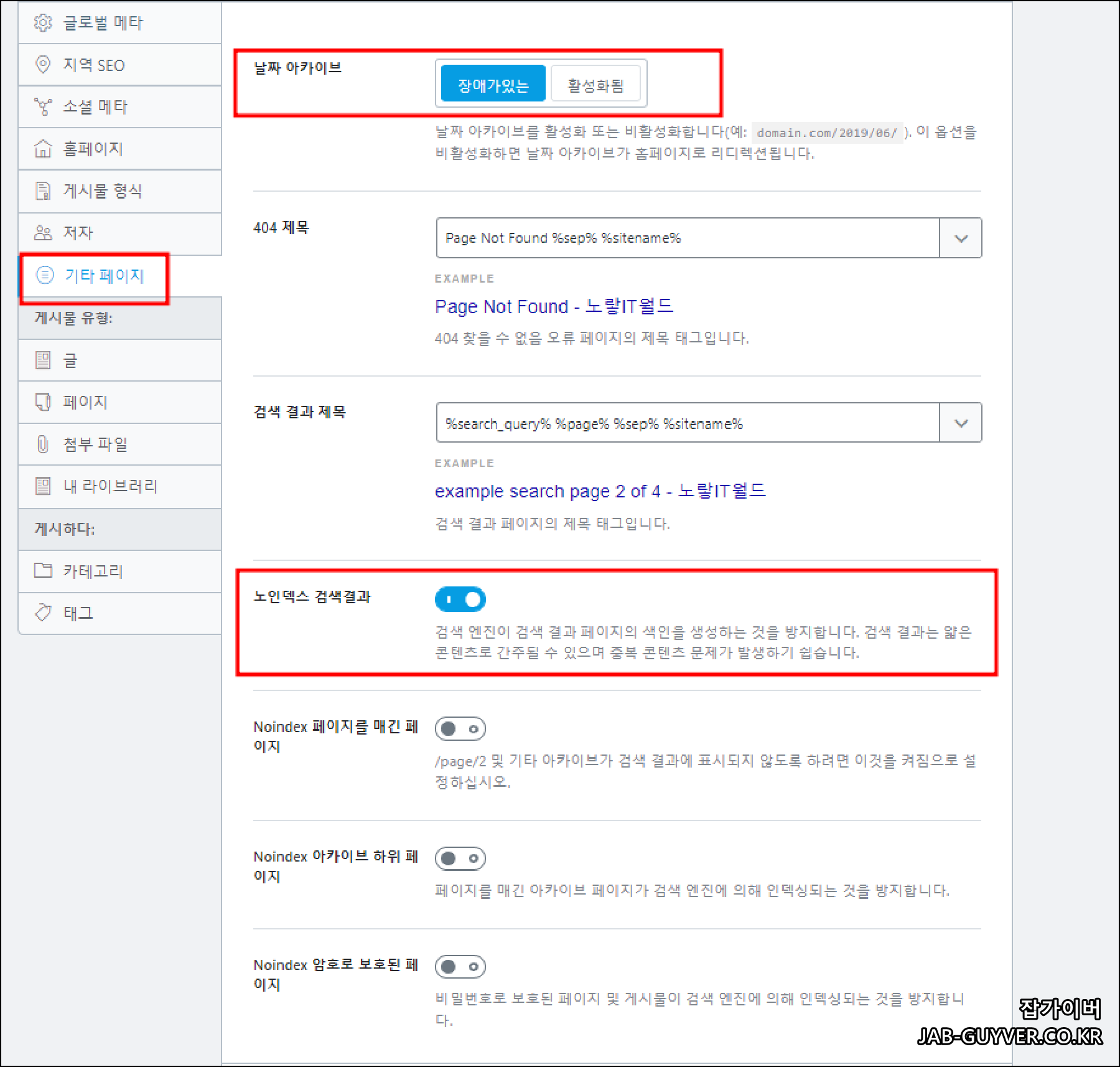 기타에서는 아카이브 검색에서 날짜별로 검색되느것이 있는데 이 기능을 활성화하면 중복 페이지가 너무 많아질 수 있기 때문에 필요에 따라 선택합니다.