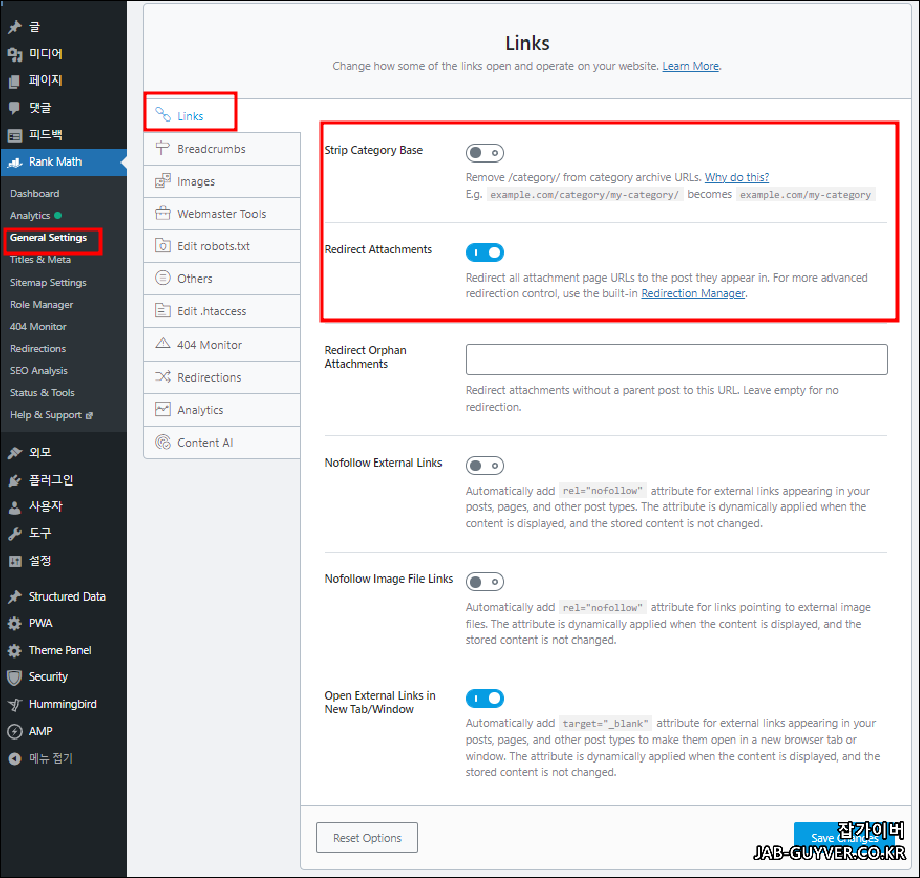 우선 기본적으로 Rank Math SEO의 링크 항목을 보면 스트랩 카테고리 베이스와 첨부파일 페이지에 대한 리디렉션을 활성화할 수 있으며 외부 링크와 이미지 파일에 대해 링크 파일을 검색엔진에 노출되도록 할 수 있습니다.