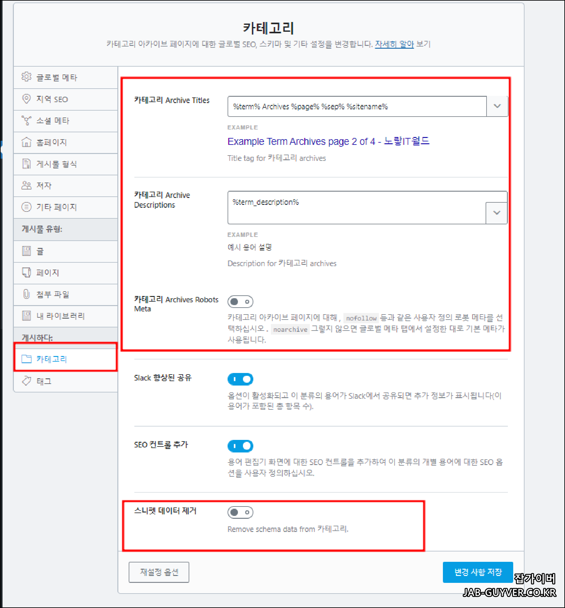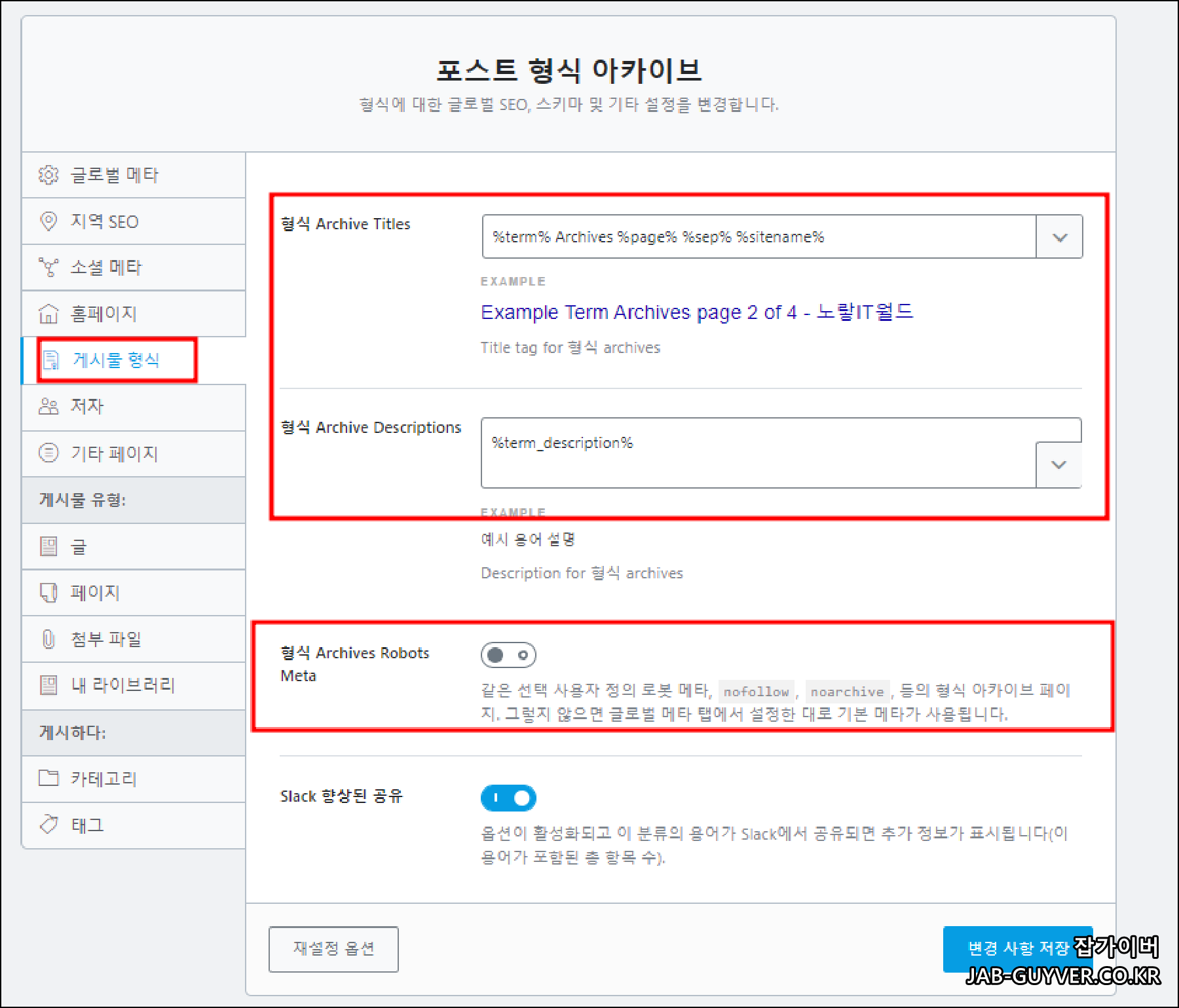 그리고 특히 구글 검색엔진에서 자주 보이는 포스트 형식 아카이브 "Archive Titles"의 이름 조합을 지정하며 형식에 대한 아카이브 로봇 정보를 설정합니다.