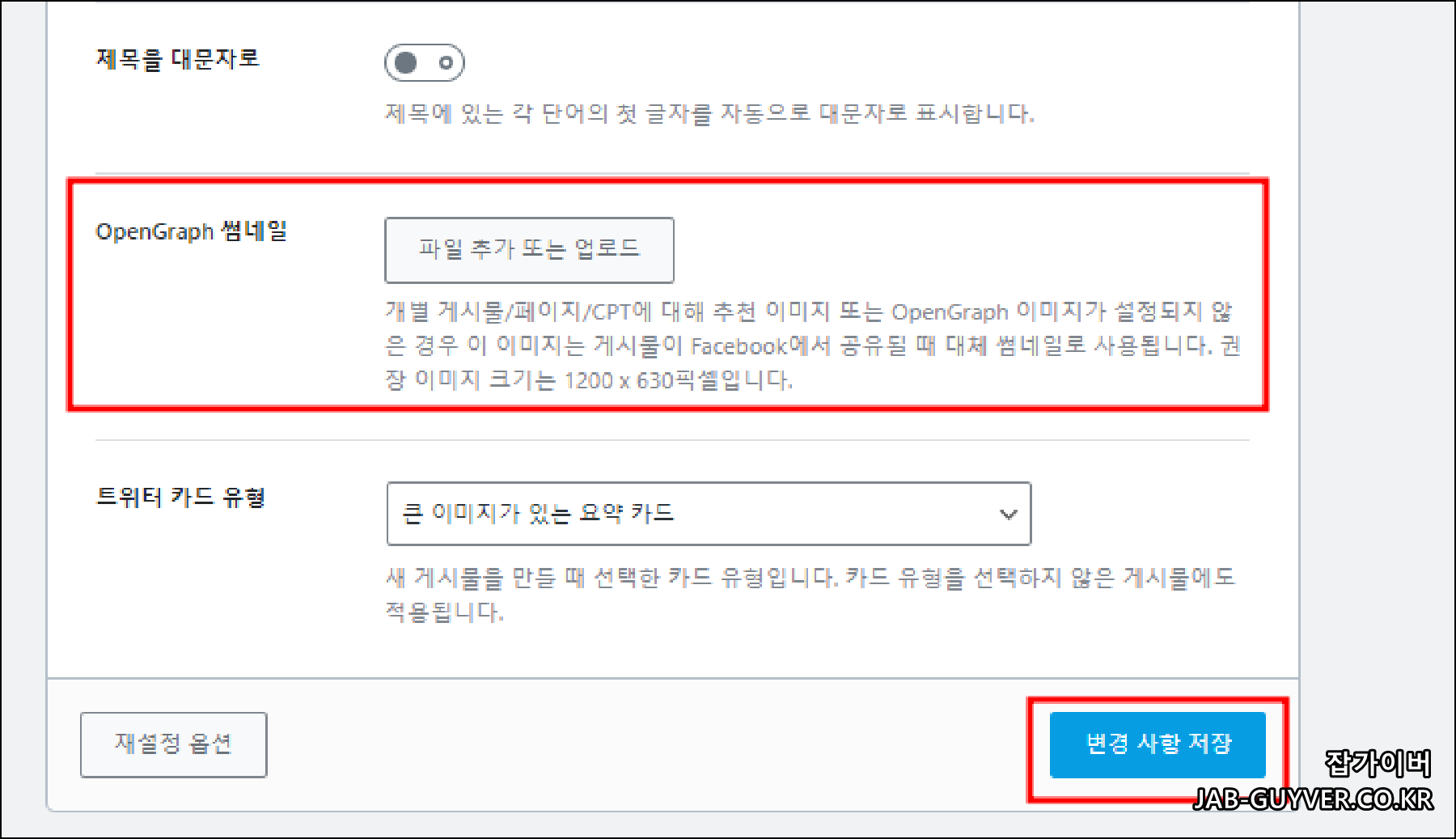 기본 설정으로 들어가면 로봇 정보에 대한 색인정보를 Index "허용"할것인지 Noindex "비허용"할 것인지의 옵션과 함께 OpenGraph 썸네일 이미지를 추가할 수 있습니다.