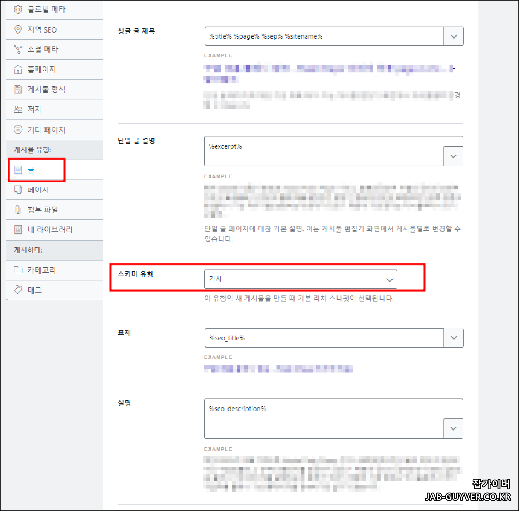 게시물 유형에서는 글과 페이지에 대한 스키마 유형을 통해 구조화할 수 있으며 검색엔진에 상위에 노출될 수 있도록 합니다.