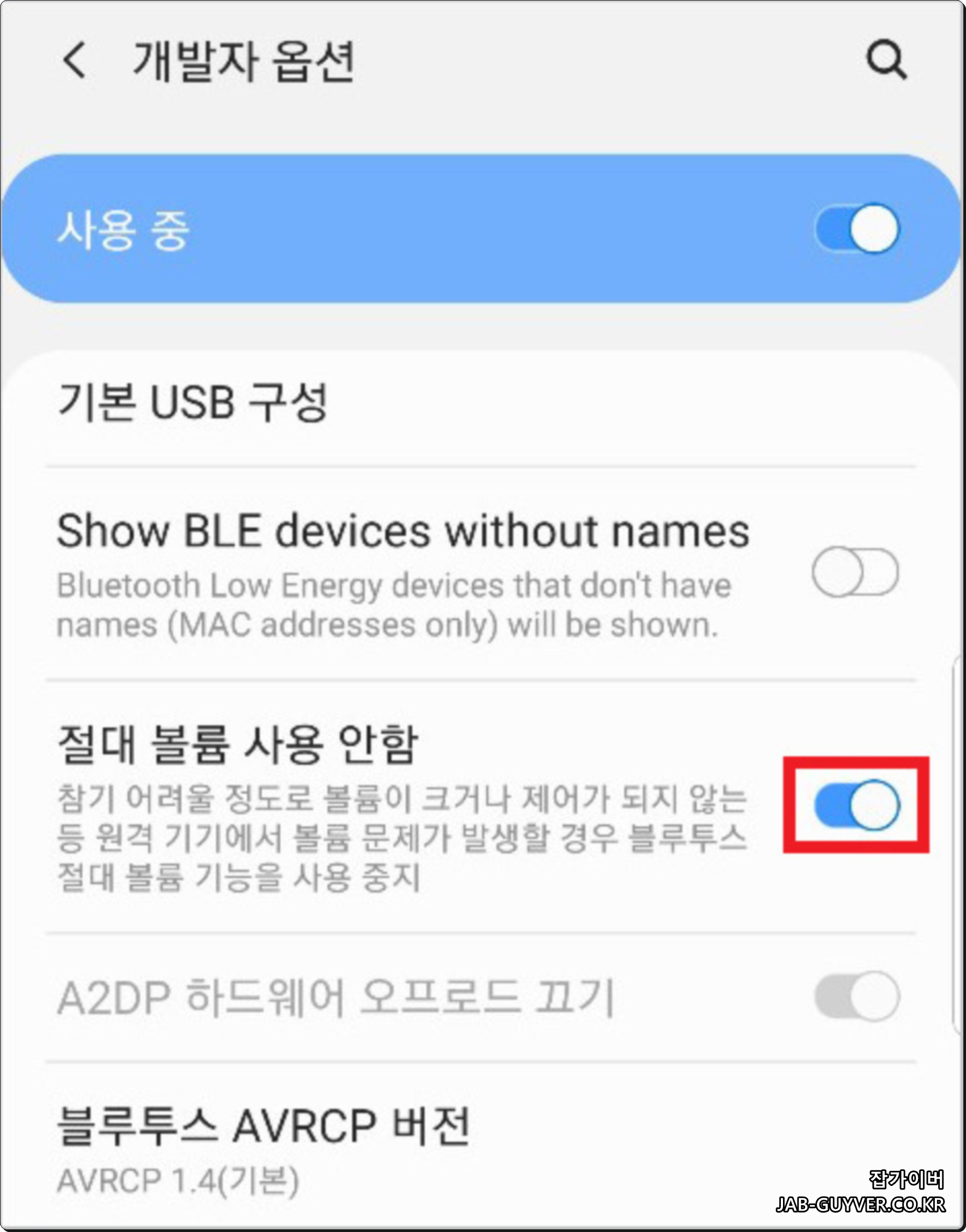 개발자옵션으로 들어가 "절대 볼륨 사용안함"을 활성화합니다.