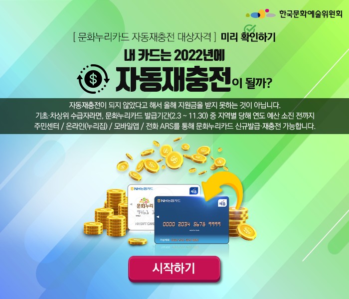 2021년에 카드를 발급받아 사용하셨다면,그리고 2022년에도 카드 발급 자격(기초생활수급자, 차상위계층)을 유지 중이시라면 귀하의 문화누리카드에 2022년도 지원금(10만 원)이 자동으로 재충전 됩니다.