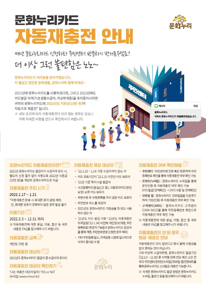 ※ 자동재충전 대상자가 아닐 경우에는 2022. 2.3 이후에 주민센터 또는 문화누리카드 누리집·모바일앱(본인인증수단 소지자)을 통해 문화누리카드를 발급/재발급/재충전 받으시기 바랍니다.