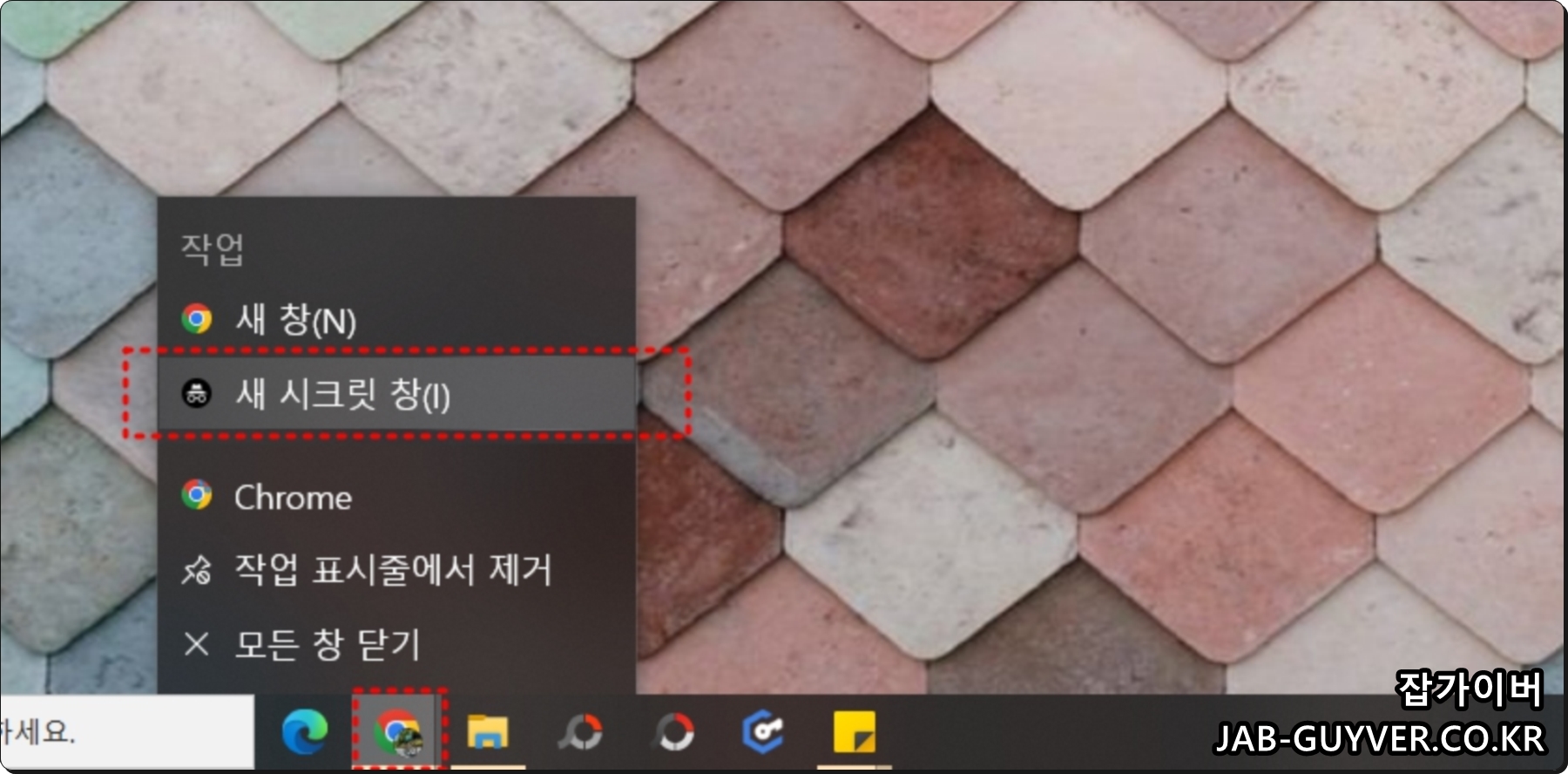 다른방법은 작업표시줄의 크롬을 우클릭해도 새 시크릿 창을 실행할 수있습니다.