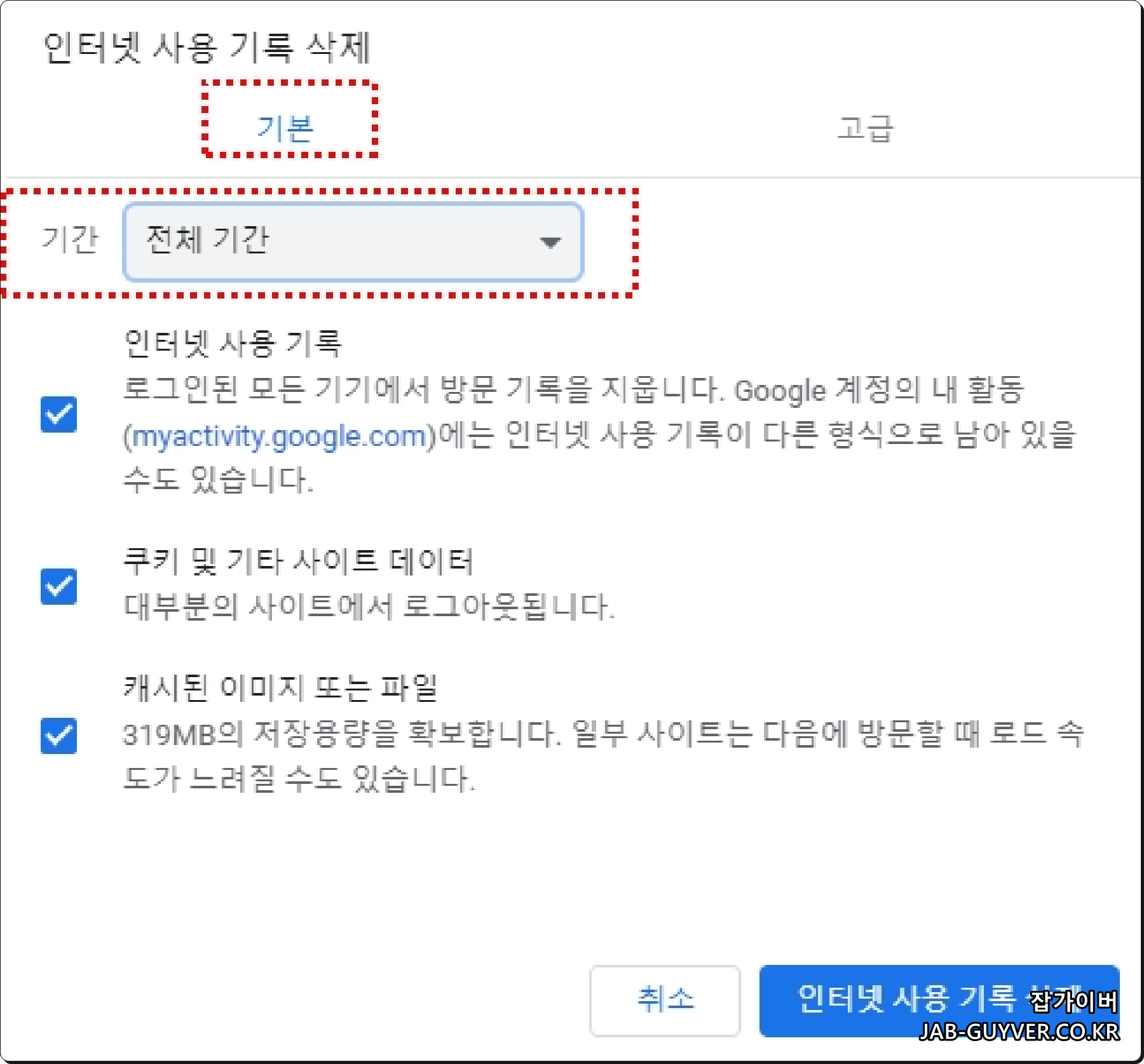 - 기본으로 설정되어 있다면 삭제하고자 하는 "인터넷 사용기록의 기간"을 선택합니다.