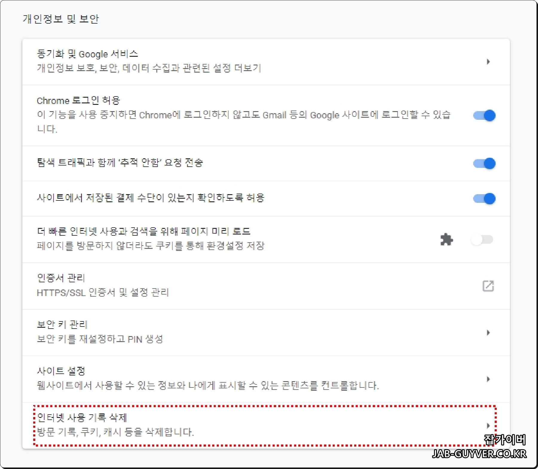 개인정보 및 보안 탭을 확인하면 "인터넷 사용 기록 삭제"항목을 볼 수 있습니다.