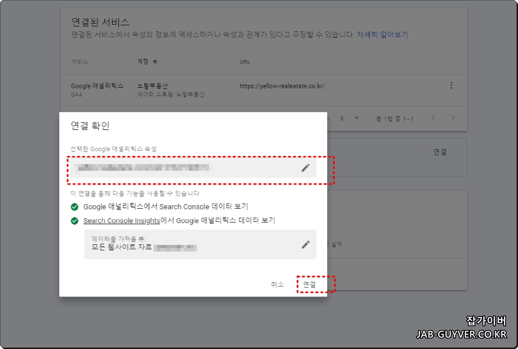 연결확인을 위한 구글 애널리틱스 속성을 확인하고 구글 서치콘솔의 데이터를 가져오느것을 확인 후 연결을 시도합니다.