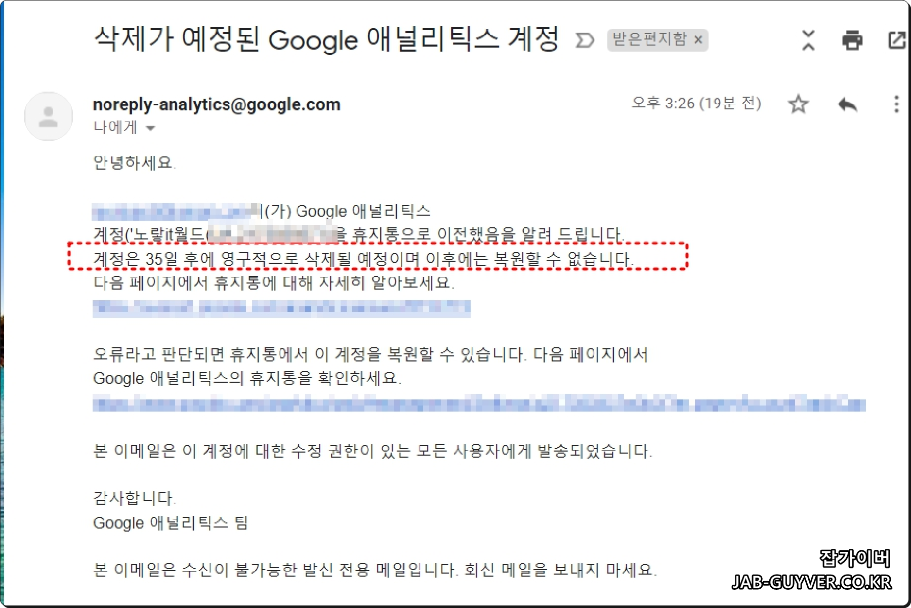 메일을 통해 확인해보면 삭제메일을 확인할 수 있으며 35일 지나면 데이터는 영구삭제되어 복구가 불가능합니다.