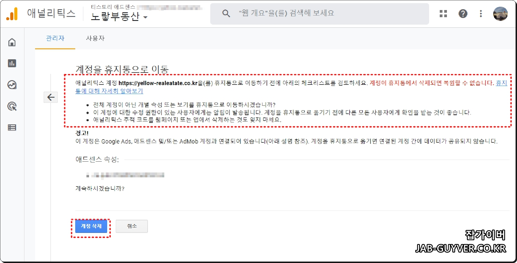 구글 애널리틱스 사이트 삭제 - 휴지통 복원