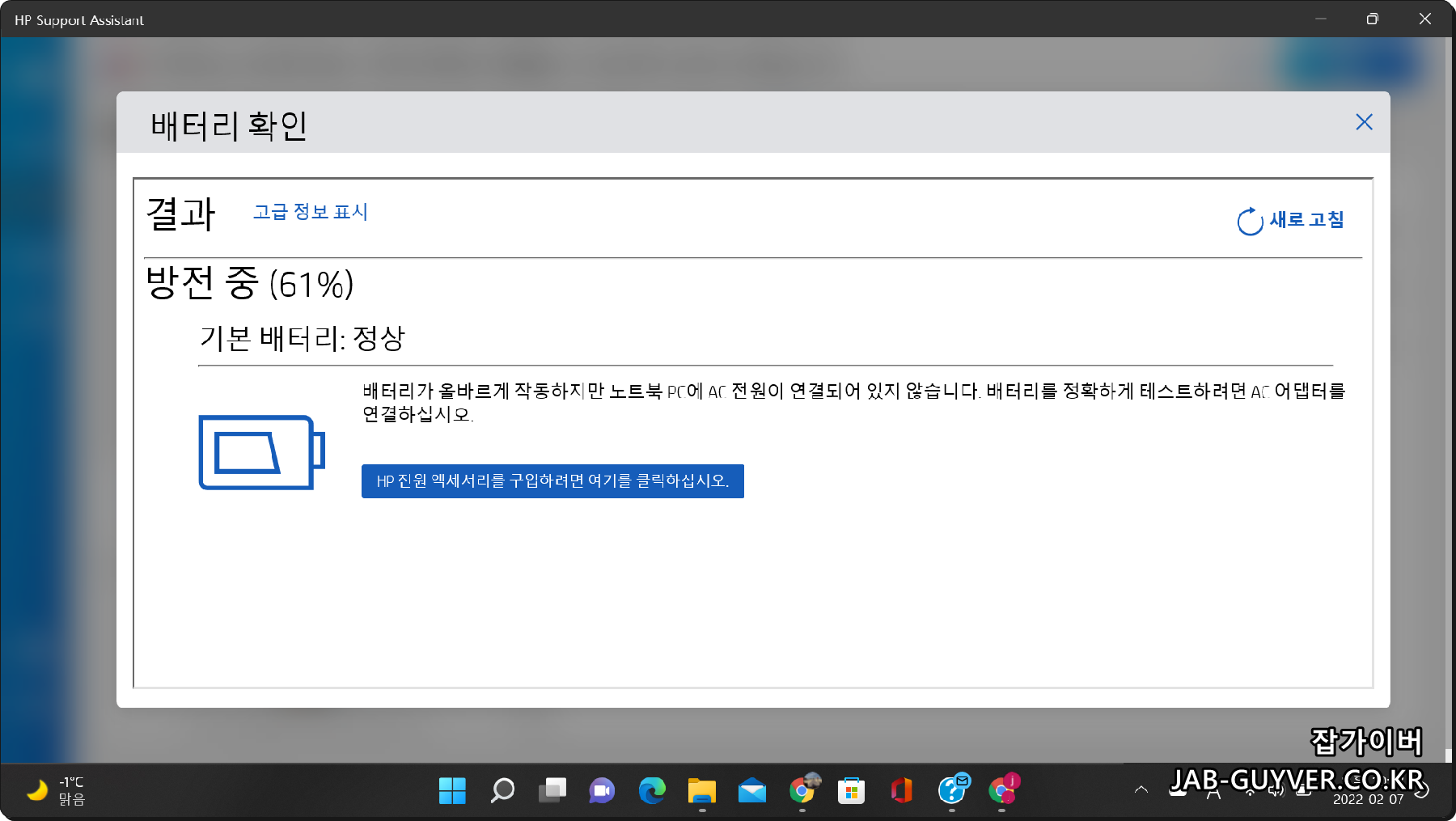 HP Support Assistant의 배터리 정보 화면을 열면 설계 용량과 실제 용량이 함께 표시됩니다. 새 제품일 때는 두 값이 거의 비슷한데, 사용 시간이 길어질수록 실제 용량이 줄어듭니다. 대략 설계 용량의 절반 이하로 떨어진다면 체감 사용 시간이 확 줄어들기 때문에, 이 시점부터는 배터리 교체를 염두에 두고 사용하는 편이 좋습니다.