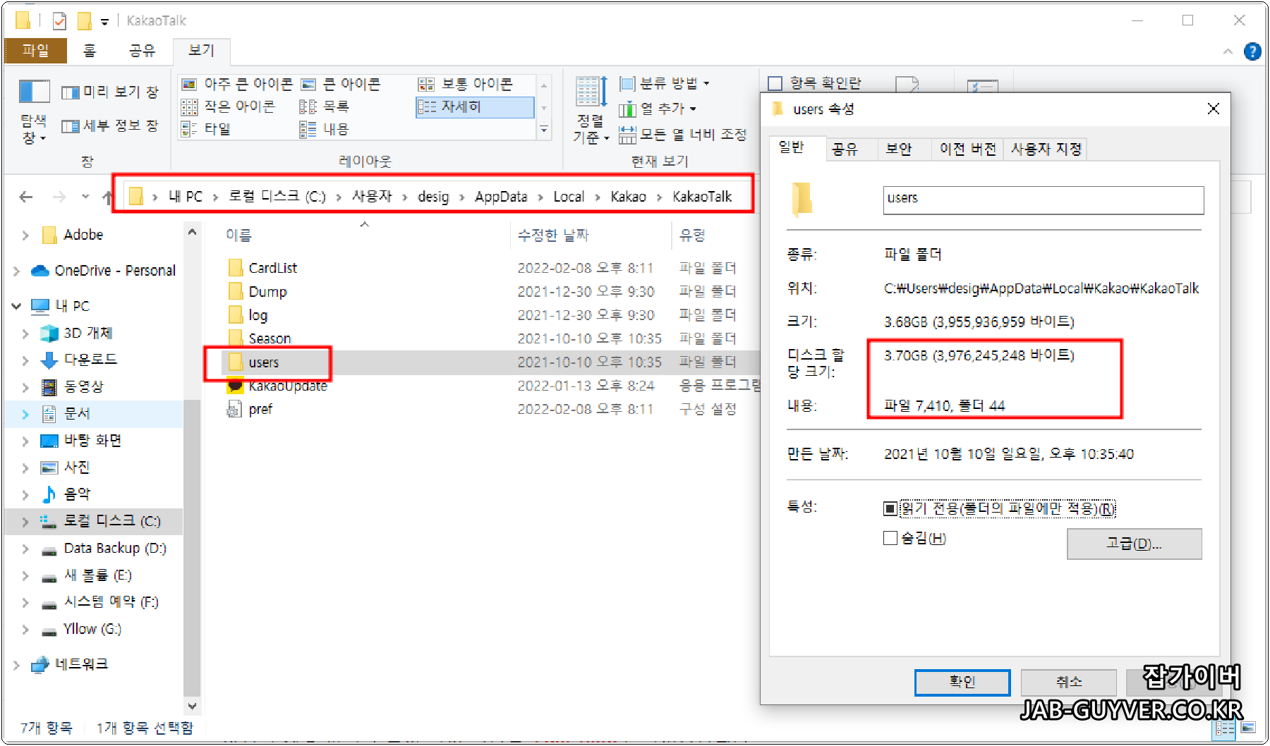 현재 제 컴퓨터에 설치된 카톡 대화내용은 총 3.7GB입니다.
