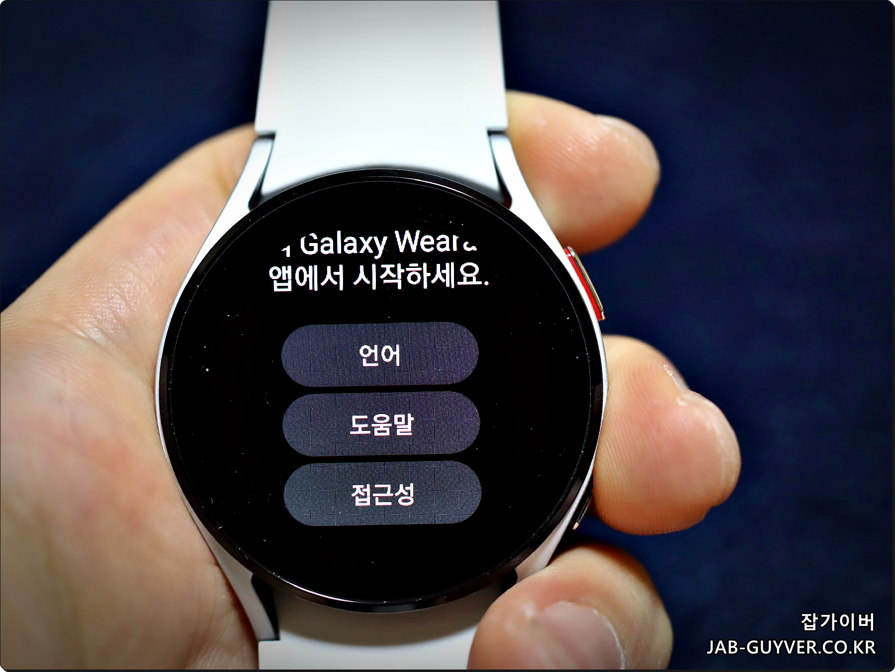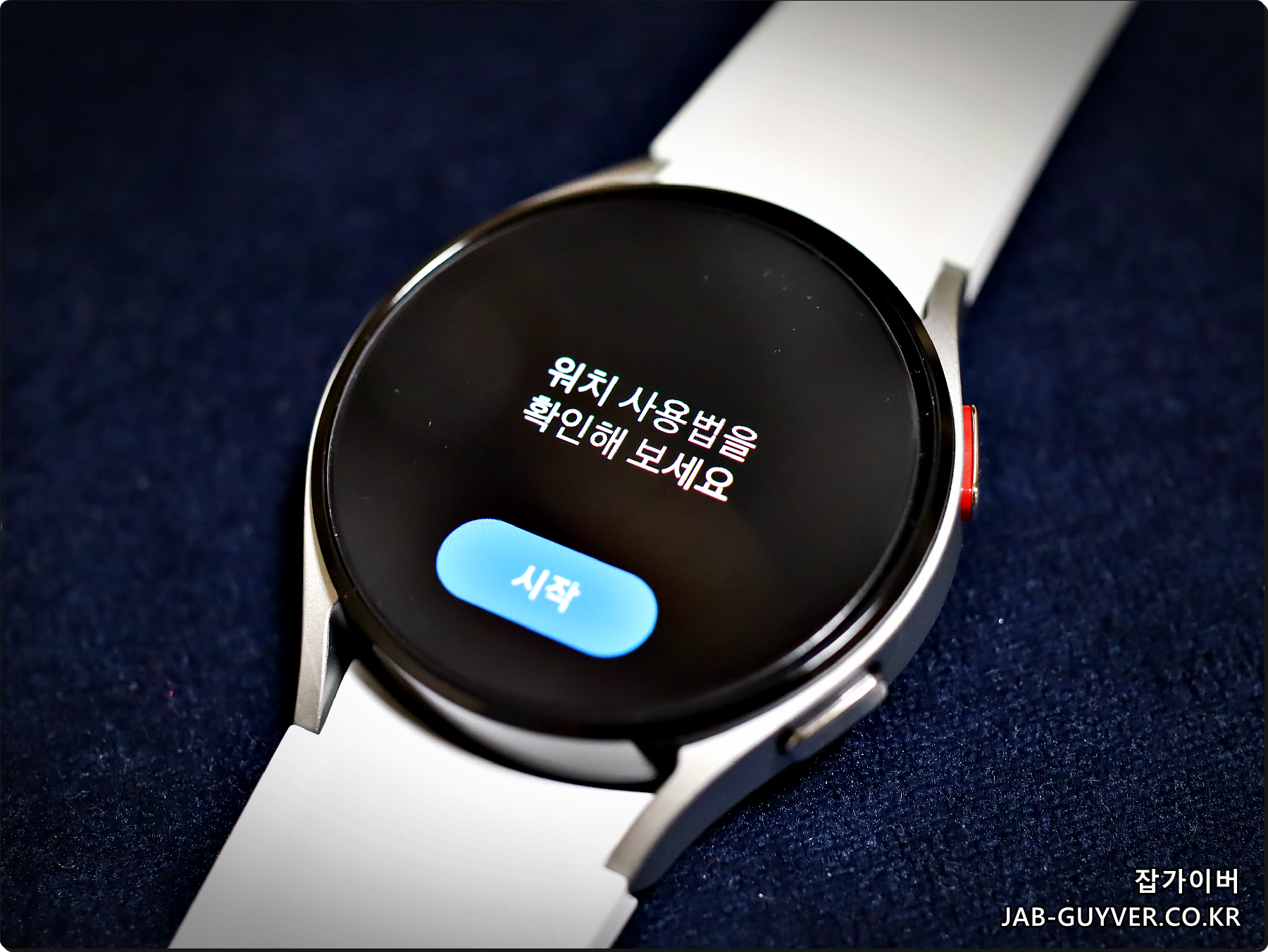 갤럭시워치4 하단 버튼을 꾸욱 눌러주면 전원이 켜지고 초기 설정이 진행됩니다.