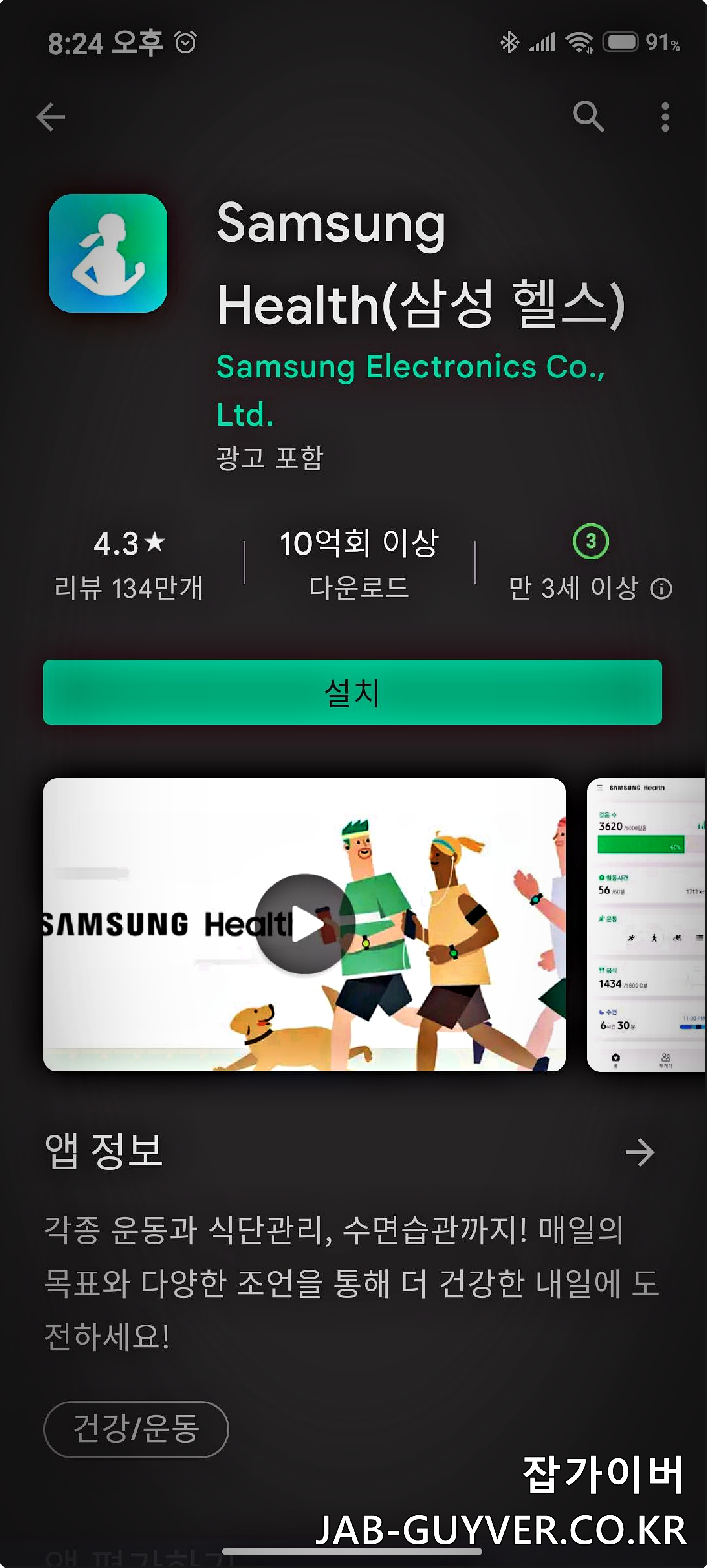 안드로이드 앱 기준 Samsung Health "삼성헬스"를 다운로드하여 설치합니다.