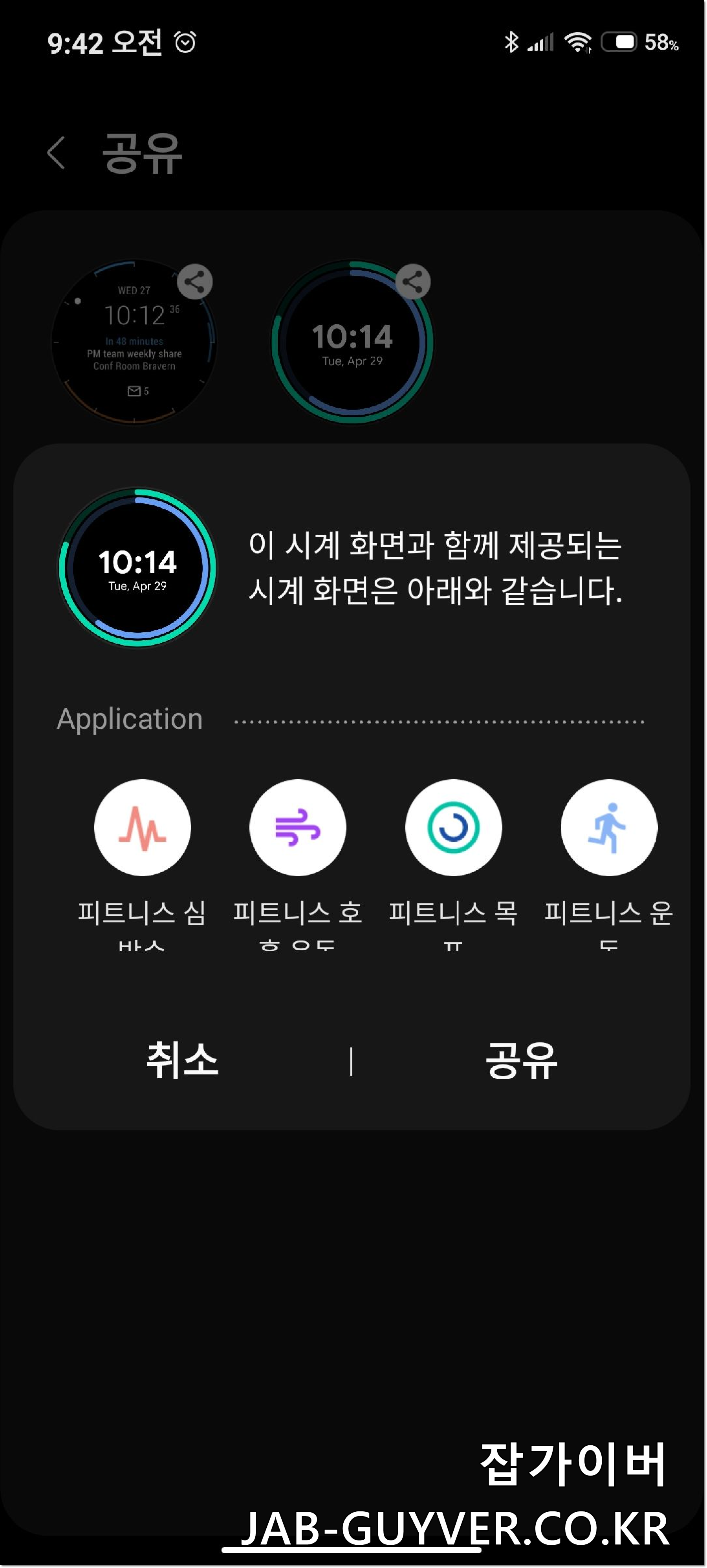 커스터마이즈 된 워치페이스는 공유를 통해 피트니스 및 카카오톡, 문자메시지, 인스타, 네이버, 스트라바등으로 전송할 수 있습니다.