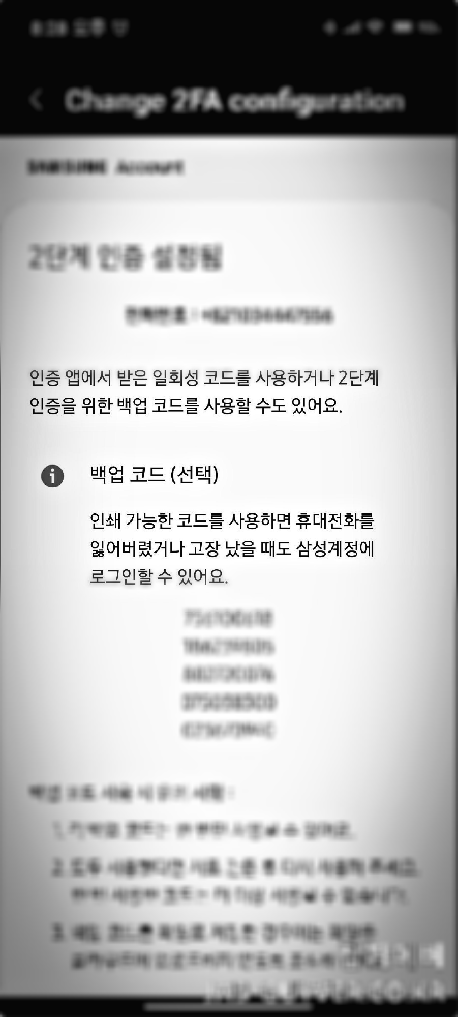 삼성 2단계 인증을 위해서 발급된 전화번호로 백업코드가 전송되며 비밀번호 분실시 이 백업 코드를 통해 복구가 가능하기 때문에 삼성 2단계인증 보안에대한 백업코드를 잘 선택 후 2단계 인증 설정을 완료합니다.