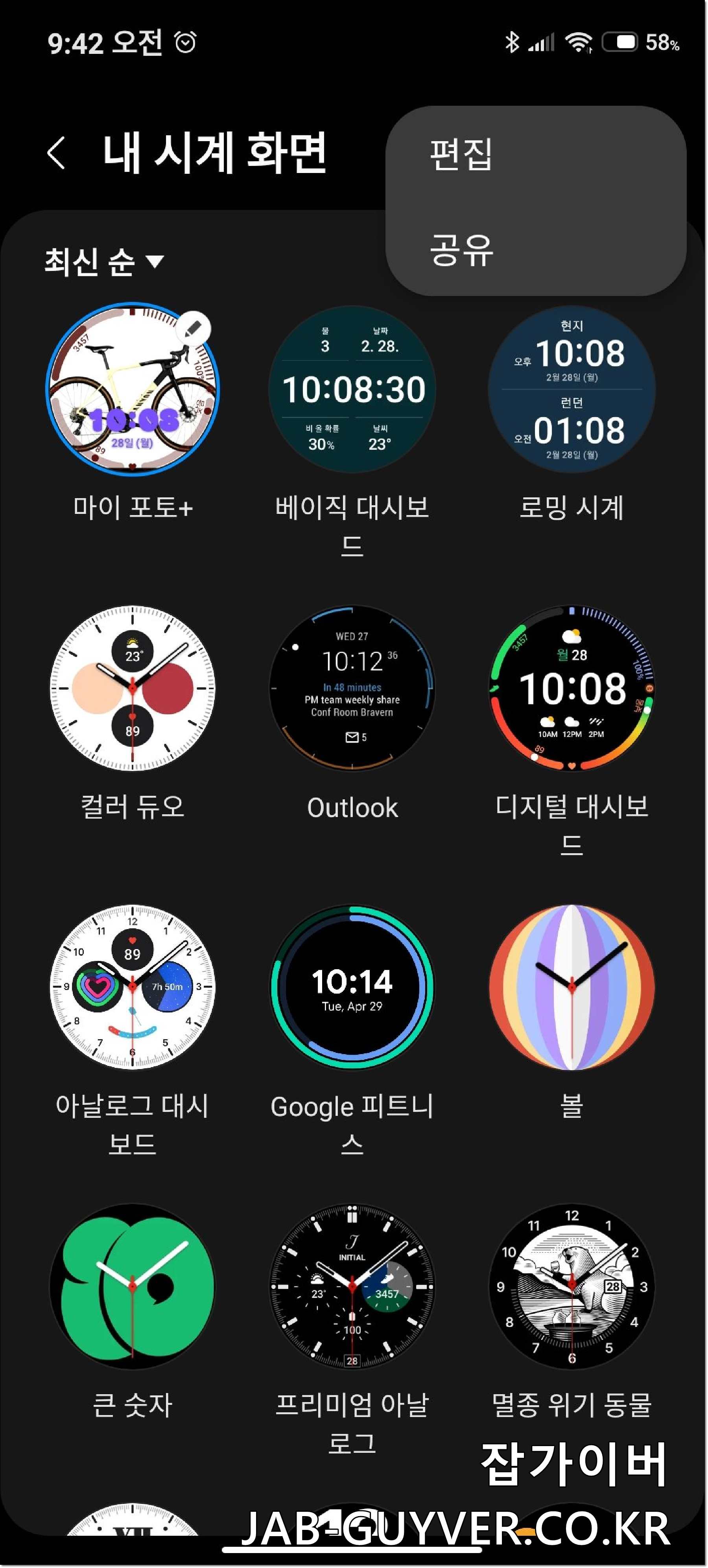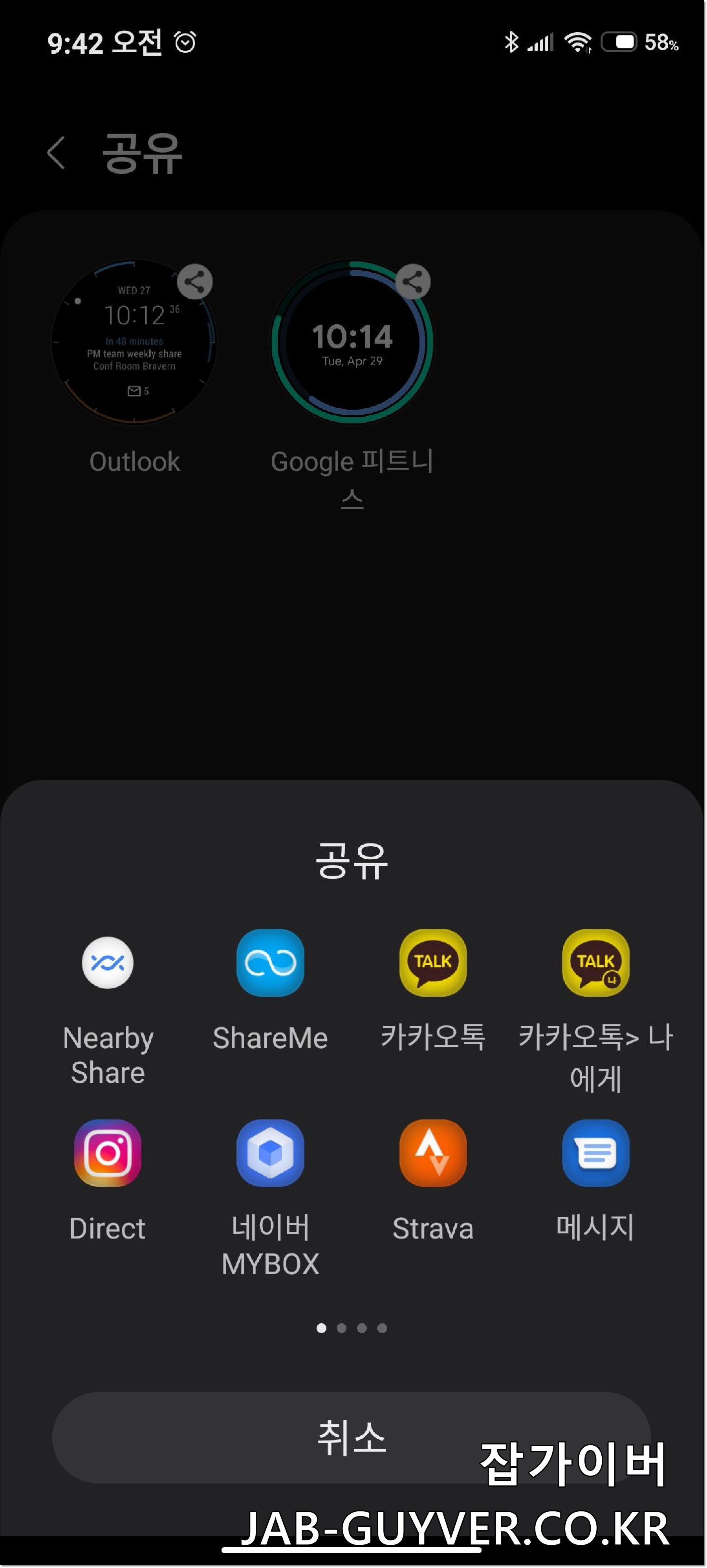 커스터마이즈 된 워치페이스는 공유를 통해 피트니스 및 카카오톡, 문자메시지, 인스타, 네이버, 스트라바등으로 전송할 수 있습니다.