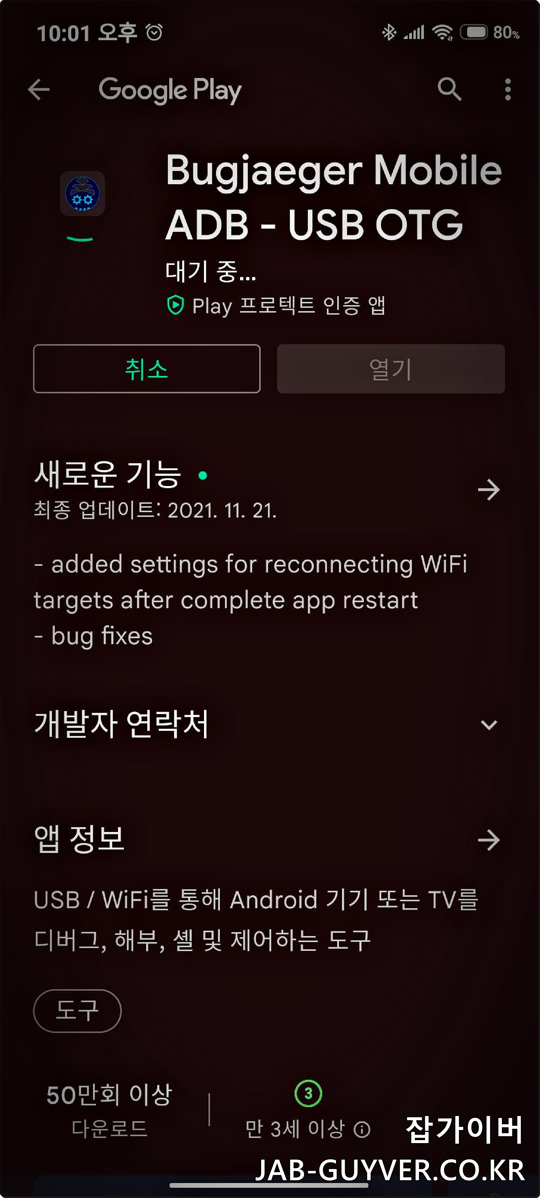 작성일 기준 Bugjaeger Mobile ADB USB OTG_v4.1_apkpure.com.APK으로 핸드폰에 설치 후 실행합니다.