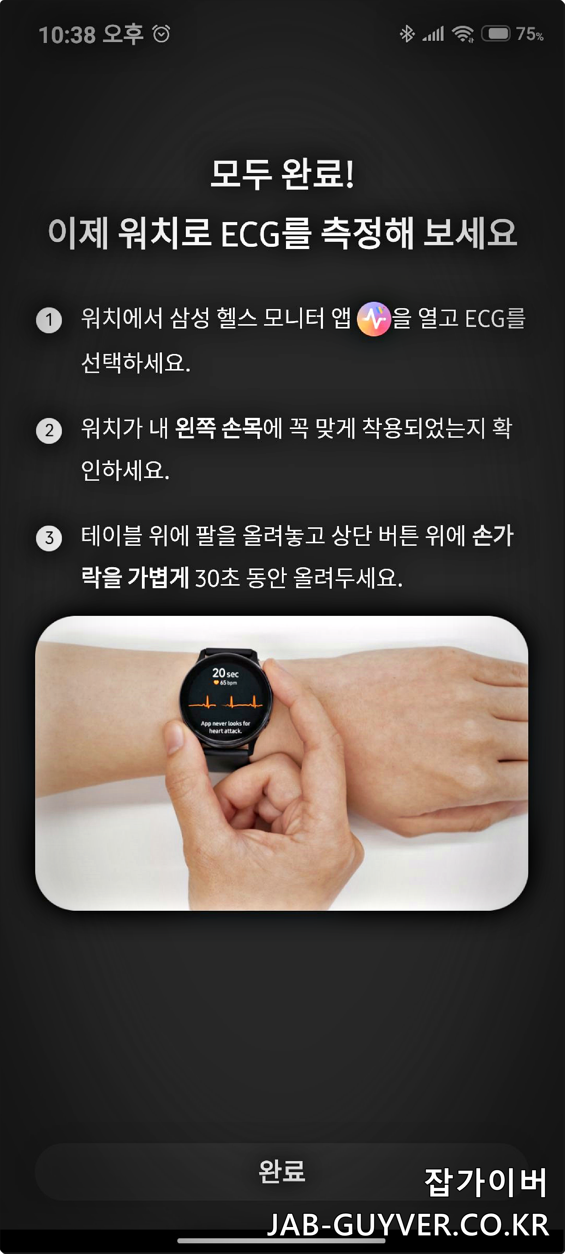 워치를 사용하는 방향을 통해 삼성헬스모니터를 실행 후 ECG를 실행 후 손가락 버튼을 통해 30초간 올려두면 측정이 가능합니다.