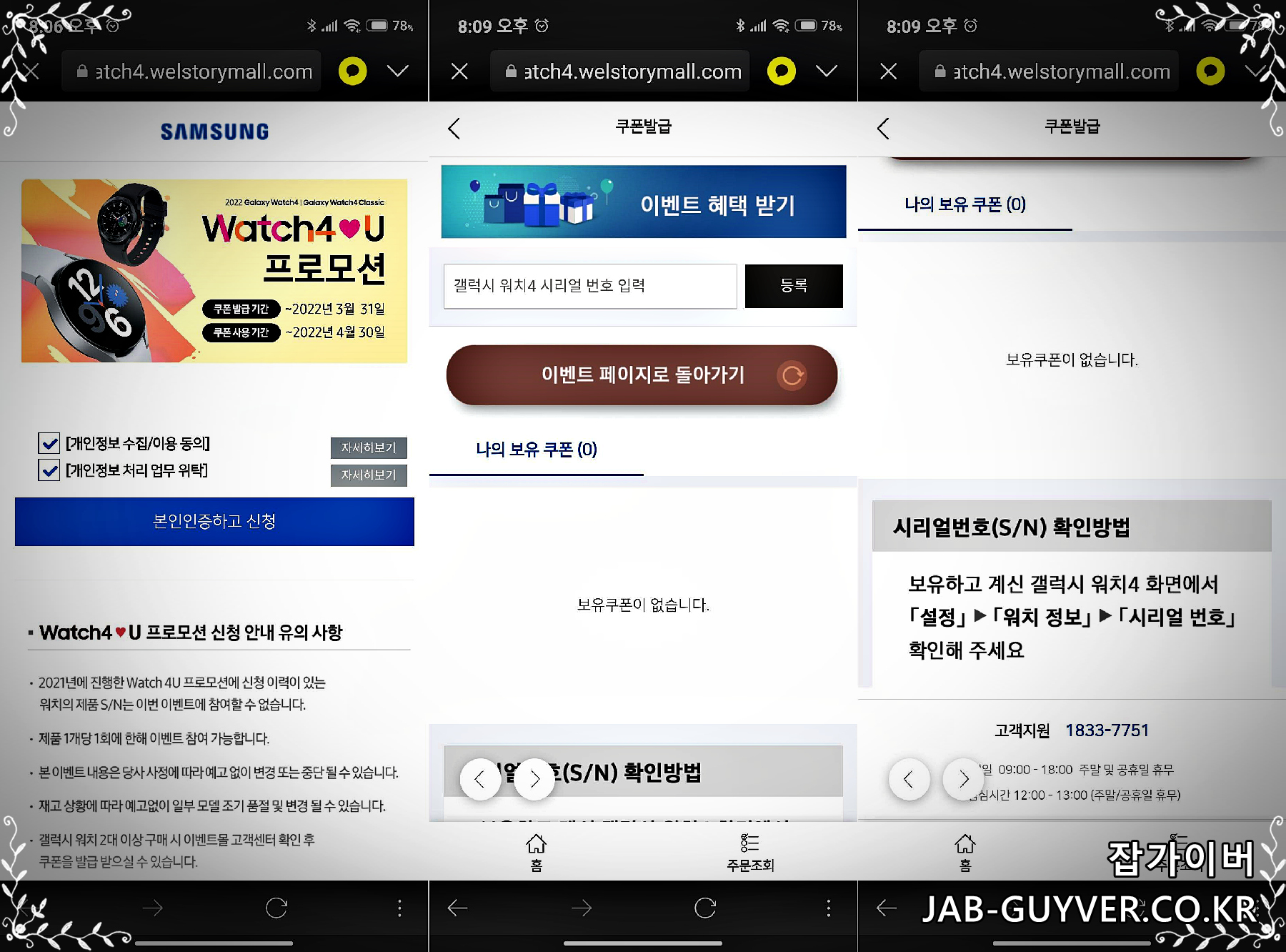 이번에 구입한 갤럭시워치4는 네이버에서 구입시 4500원 플러스멤버쉽을 가입하면 15000원 적립금을 받아 구입할 수 있습니다. 그리고 현재 3월까지 갤럭시워치 프로모션으로 구입 후 시리얼번호를 등록하면 3만원의 적립금을 줍니다 (사실 배보다 배꼽이 더 큰거 같은 상술같지만 넘어가지 않으면 그래도 아쉬운건 현실)