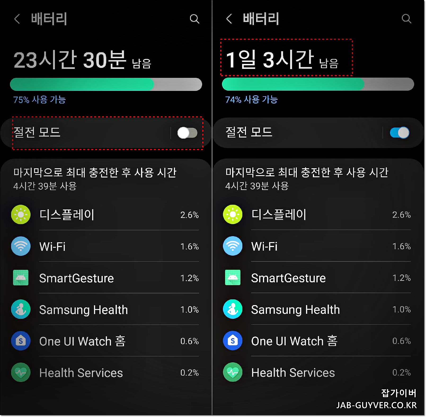 절전모드 사용시 23시간 30분 -> 1일3시간 사용이 가능하며 절전모드사용시 4시간정도 사용시간이 늘어납니다.