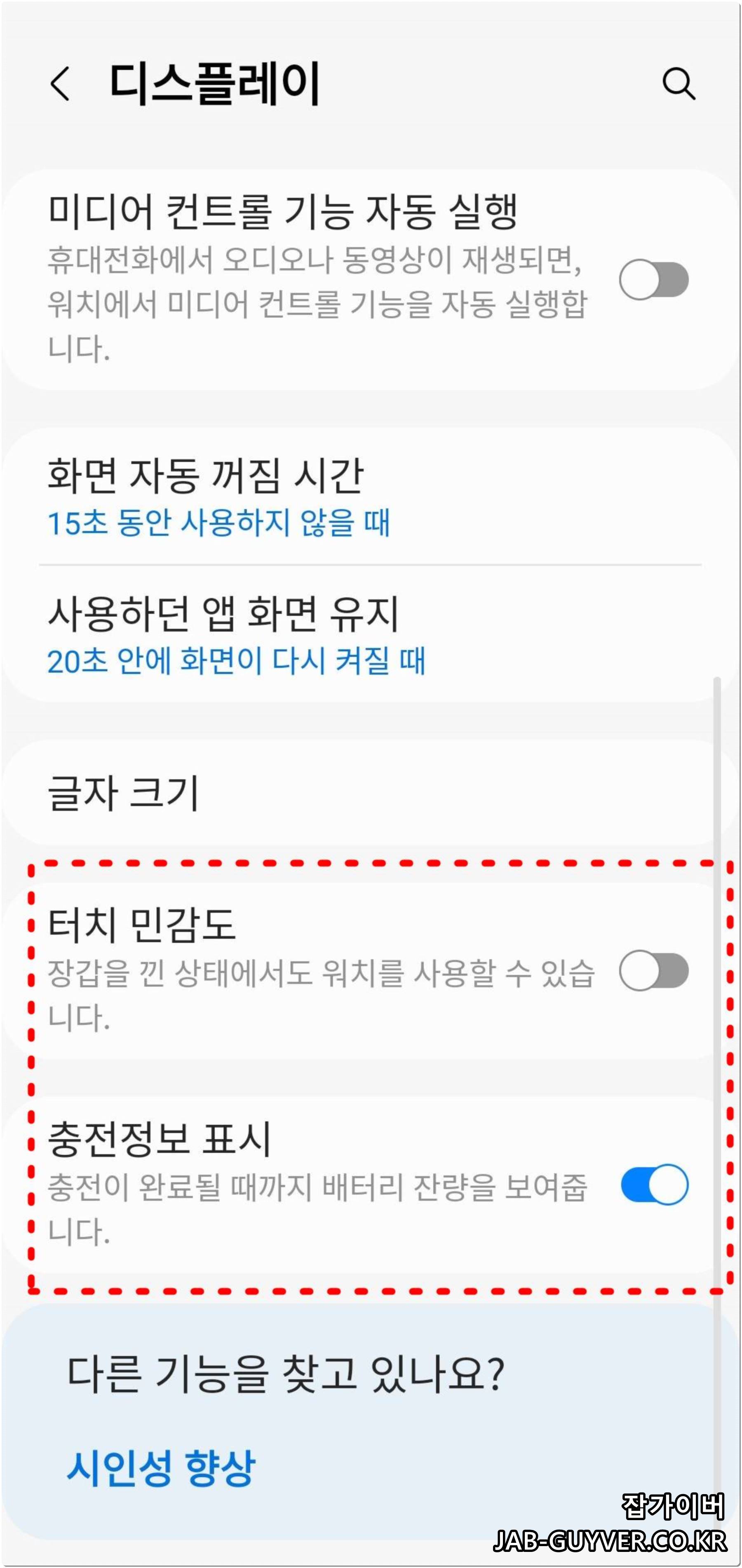 그리고 손목올려켜기 및 터치로켜기, 화면자동꺼짐 시간, 터치민감도 등을 모두 꺼주느것이 좋습니다.