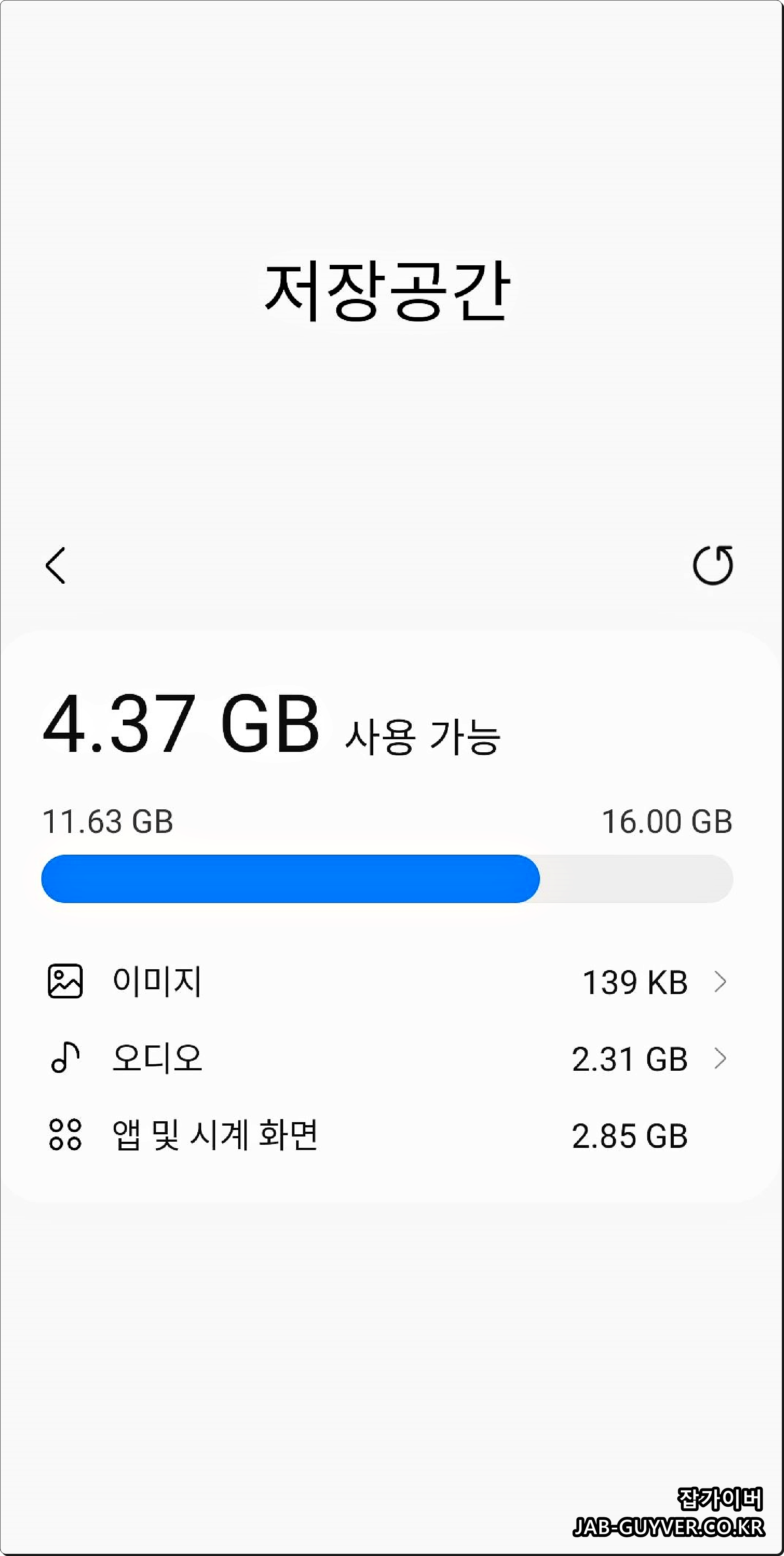 갤럭시웨어러블 -> 저장공간으로 들어가면 현재 갤럭시워치4 메모리 저장공간이 16GB 중 이미지, 오디오, 설치 앱 및 시계화면 용량의 사용용량과 남은 용량을 확인하고 삭제할 수 있습니다.