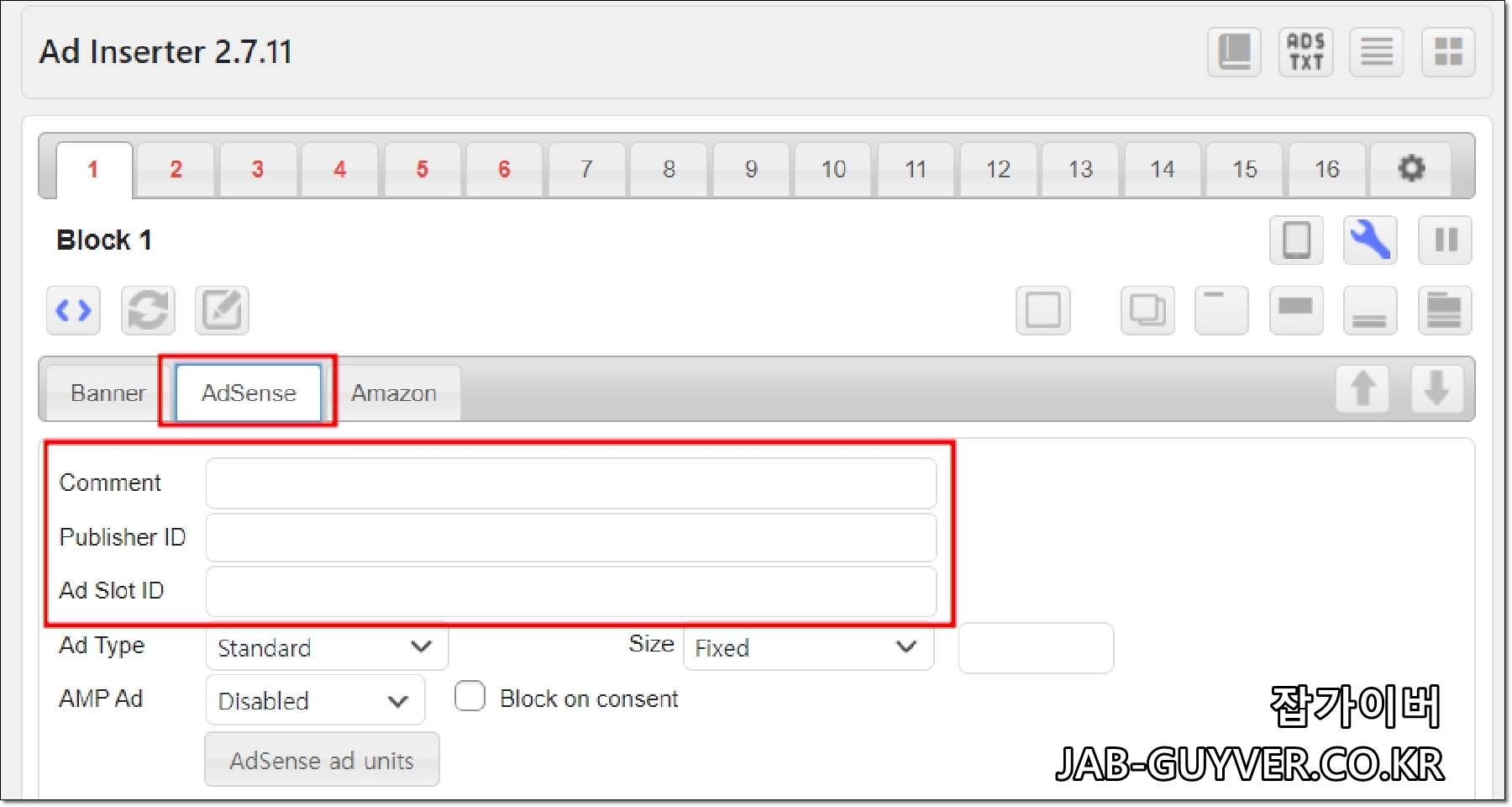 Adsense 탭에서 Comment와 Publisher ID, AD SLOT ID 입력부분에 자신의 애드센스 코드를 넣어줍니다.