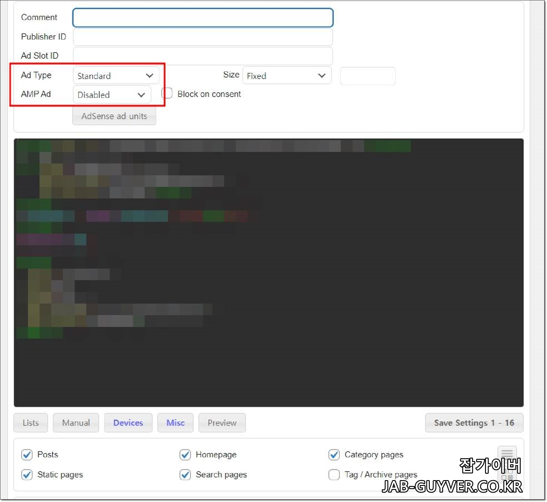 광고설정에서 애드센스 광고코드를 삽입하고 Post, Homepage, Category Pages, Static Pages, Search Page, Tag / Archive Pages등 위치를 선정할 수 있습니다.