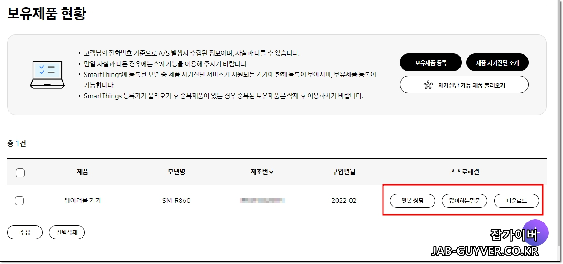 이렇게 모델명과 제조번호, 구입년월을 등록하면 해당제품에 대한 서비스로 문제나 문의사항을 쳇봇상담 및 자주하는 질문등을 확인할 수 있으며 다운로드를 통해 갤럭시워치 소프트웨어 다운로드가 가능합니다.